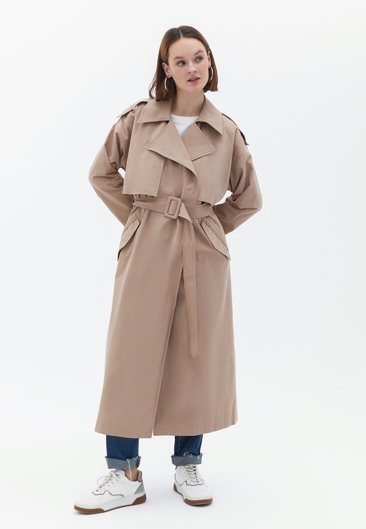 Bej Kemerli Oversize Trençkot