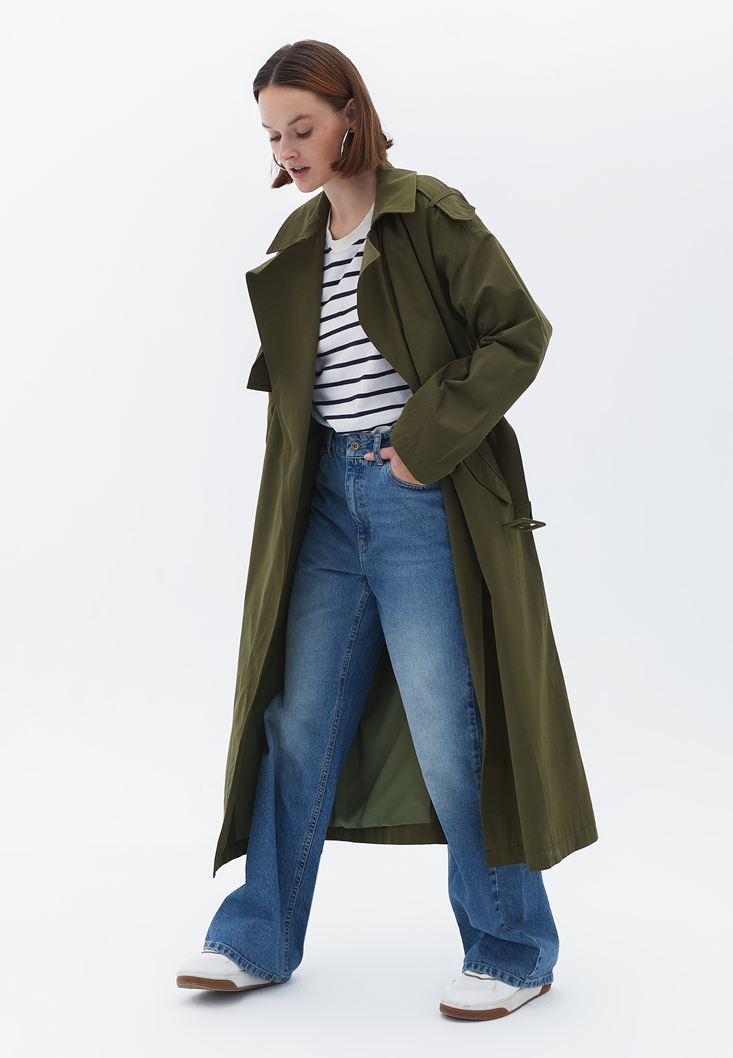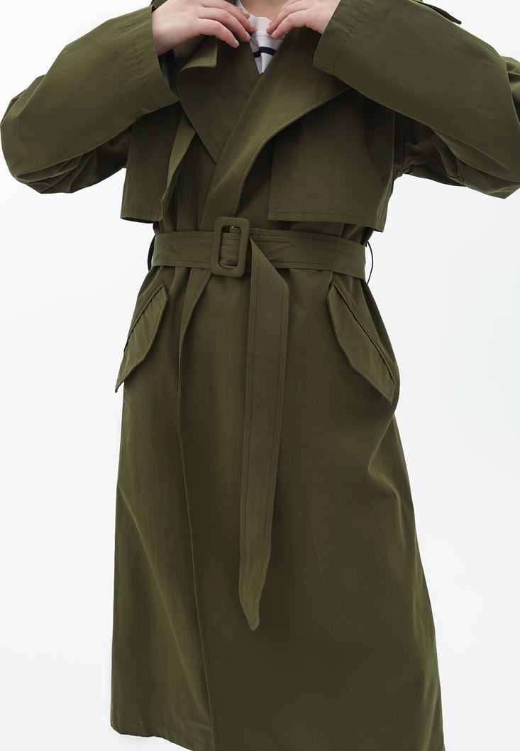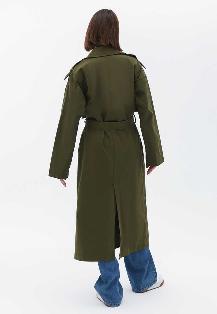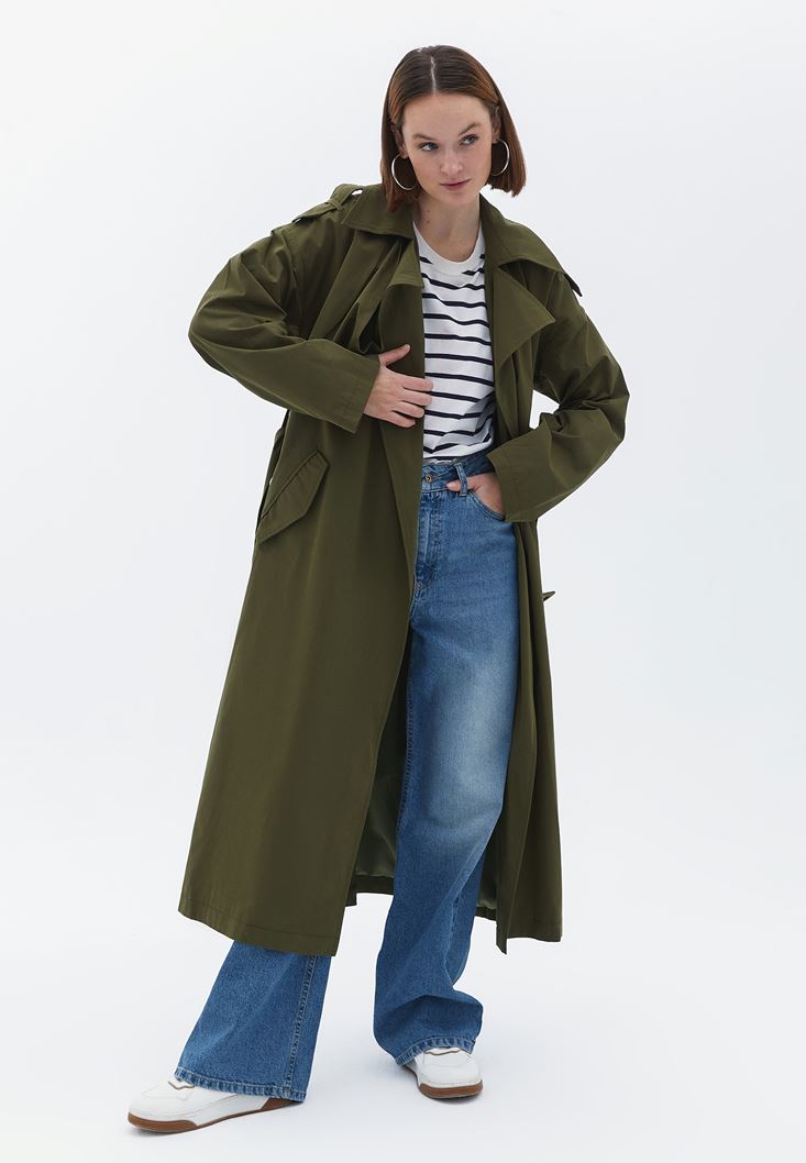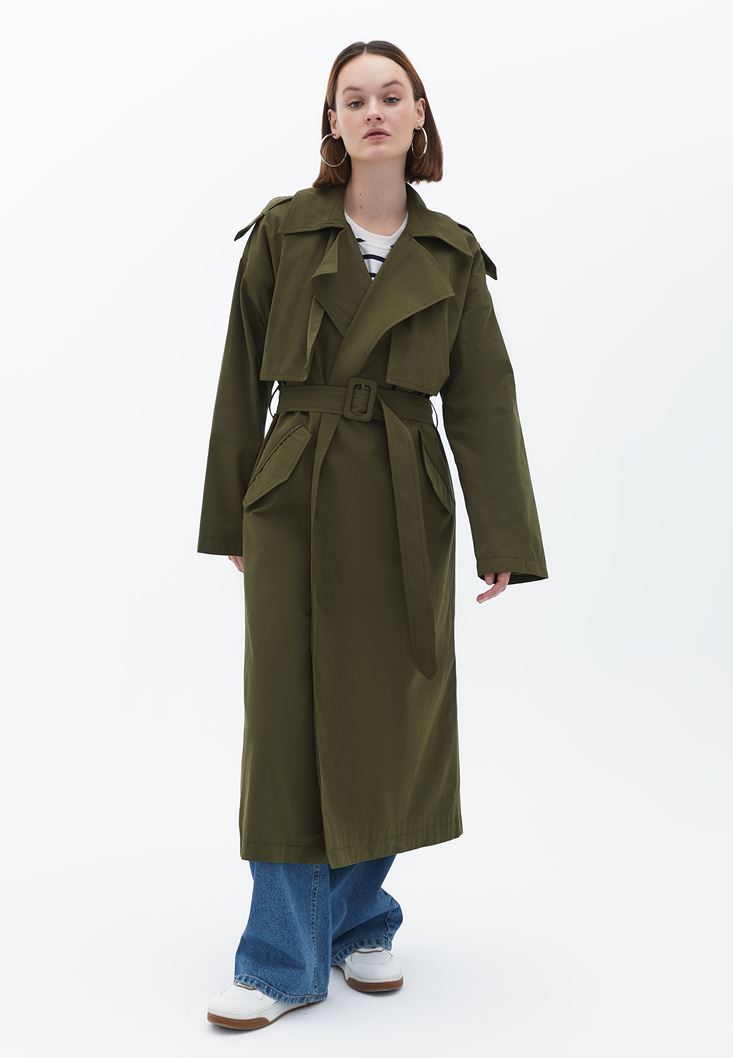 Pamuk karışımlı doku, bedenden uzak oversize fit, uzun boy, kendi kumaşından kemerli, iki cepli, omzu apolet detaylı, kol ucu kemerli, arka kısmı tek yırtmaçlı.