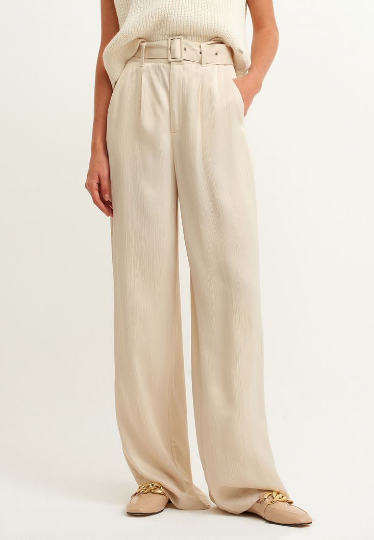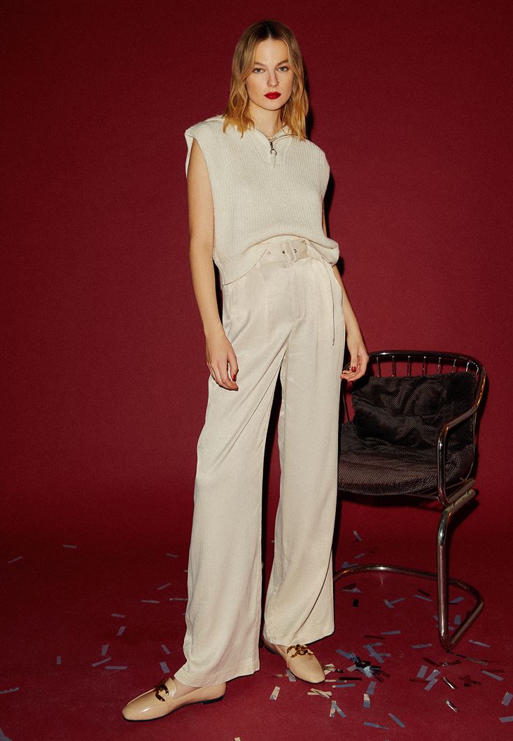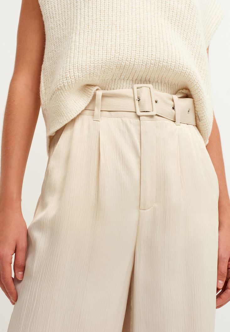 Bej Kemerli Saten Pantolon