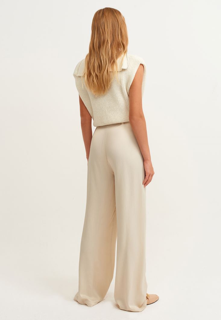 %100 viskon içerikli, ultra yüksek bel, kendi kumaşından kemerli, ön bel kısmı pile detaylı, bol paça, saten görünümlü parlak doku, önü iki cepli.