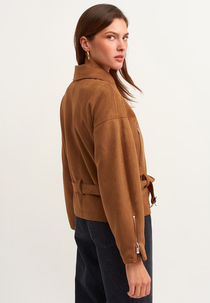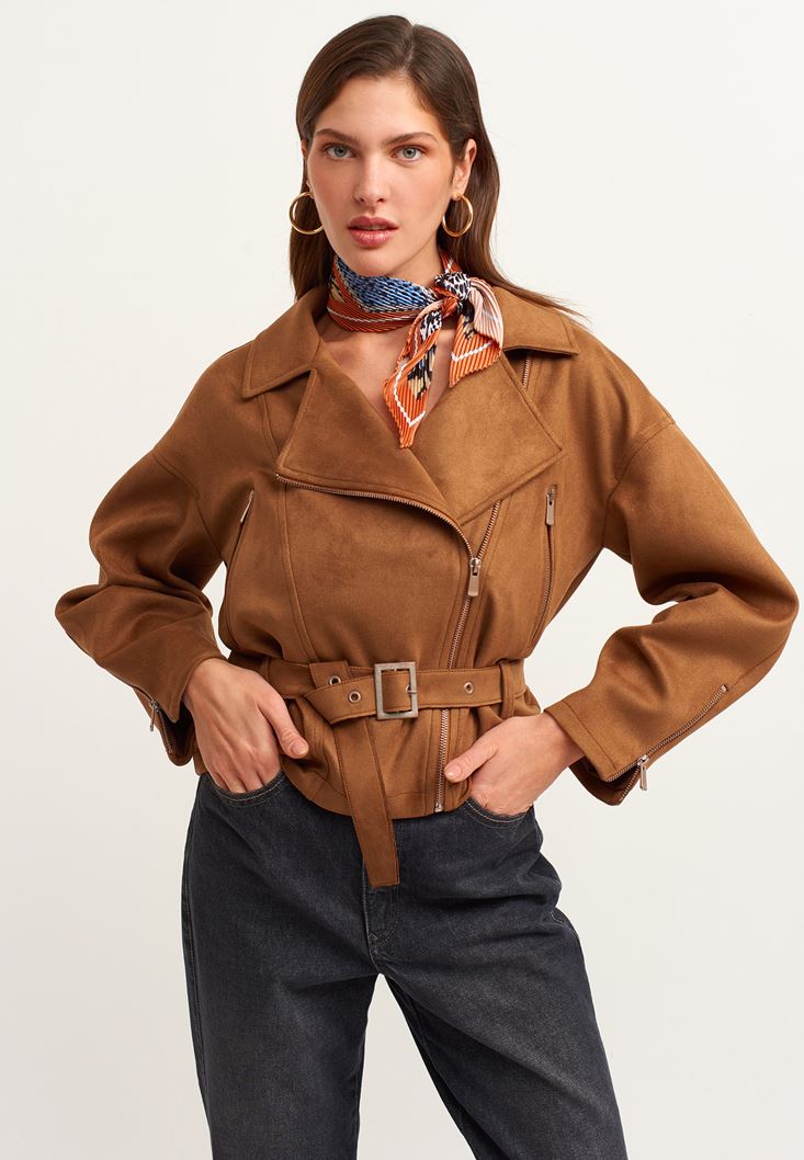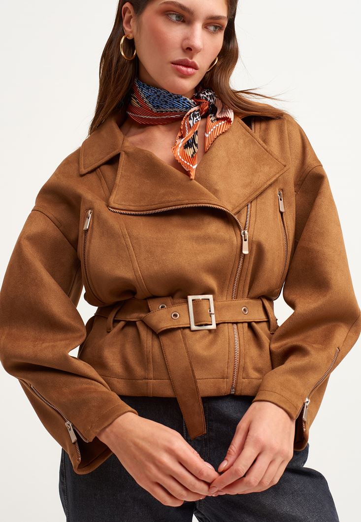 • Bayan Kahverengi Kemerli Vegan Biker Ceket