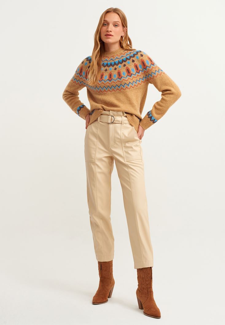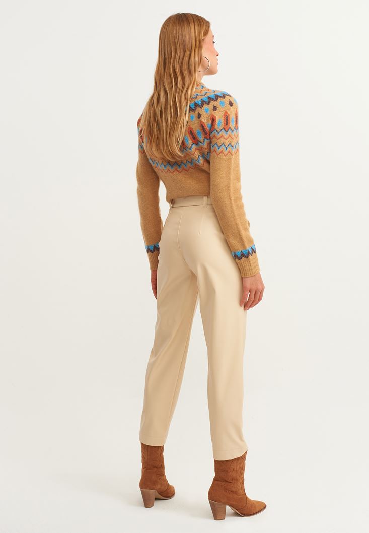 • Bayan Bej Kemerli Vegan Deri Pantolon