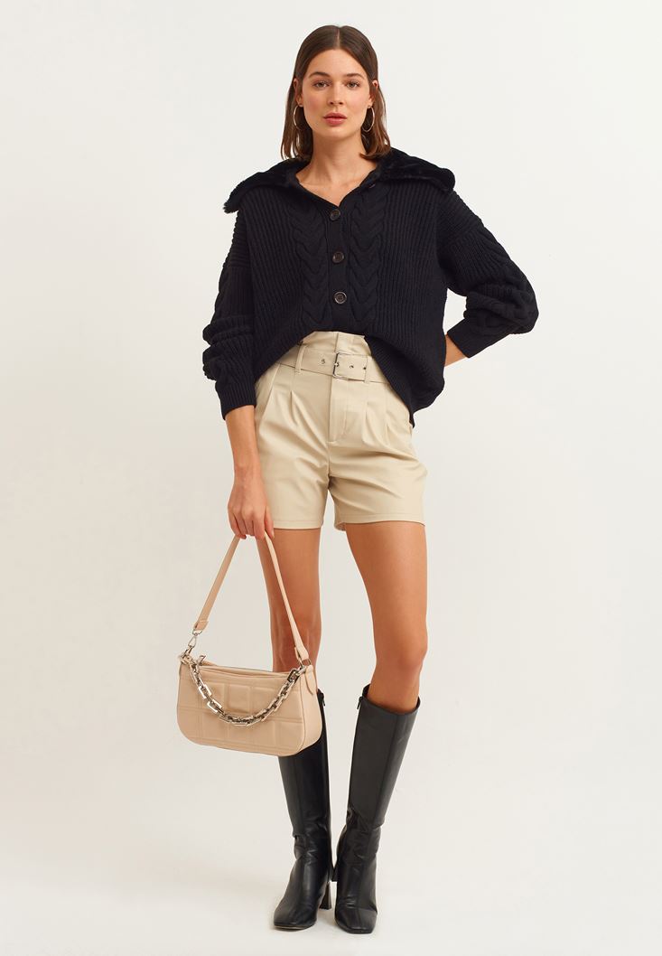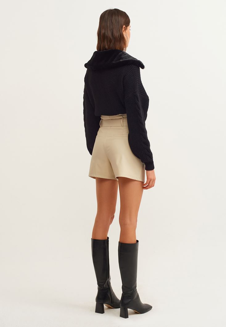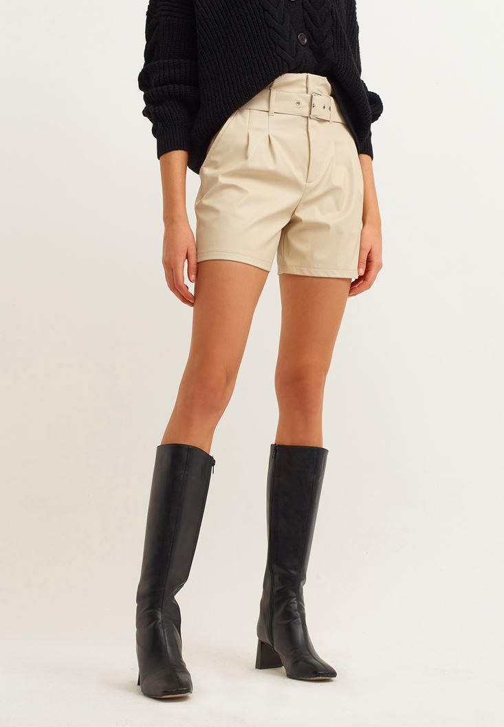 Vegan deri doku, yüksek bel, bel kısmı pileli, önü iki cepli, arka kısmı cep görünümlü, kendi kumaşından tokalı kemer tasarımı, mini boy, bedene yakın rahat fit.