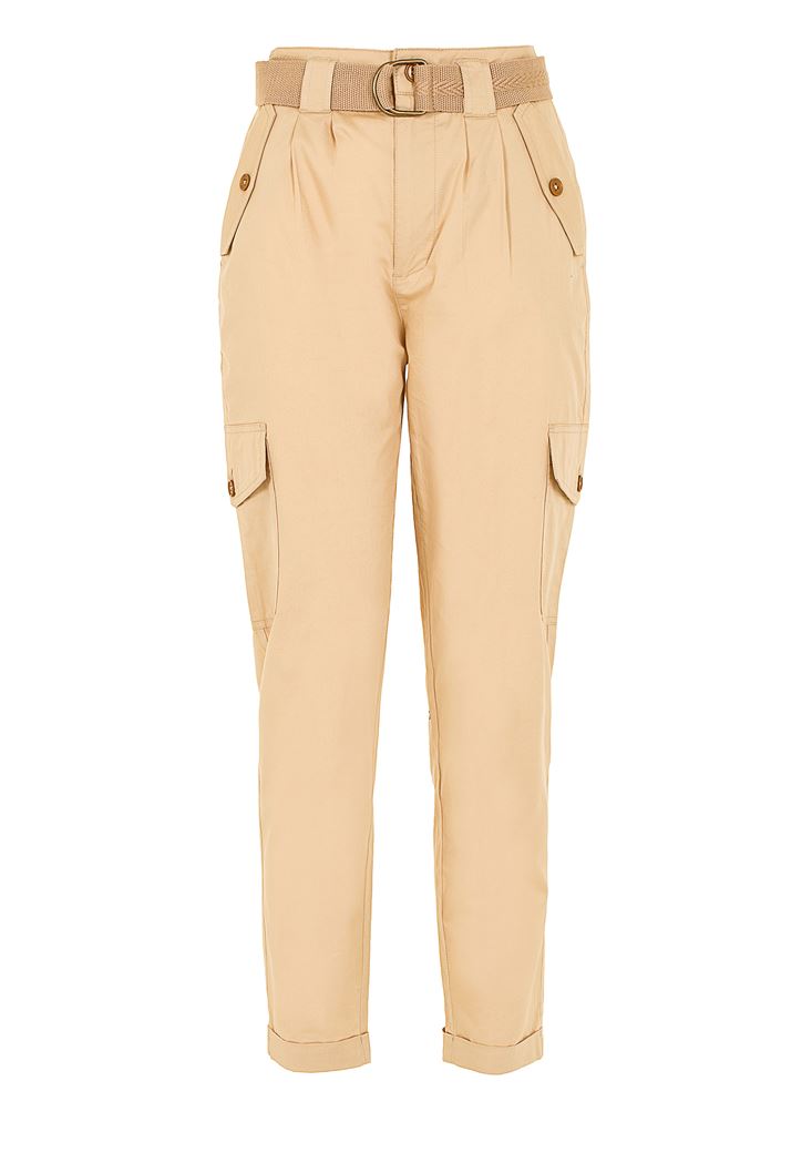 Krem Kemerli Yüksek Bel Kargo Pantolon