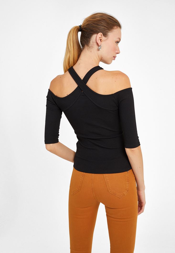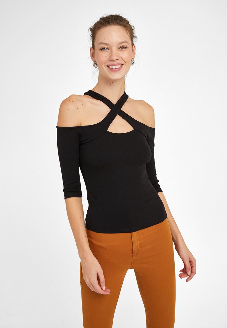 • Bayan Siyah Kesik Yaka Detaylı Tişört