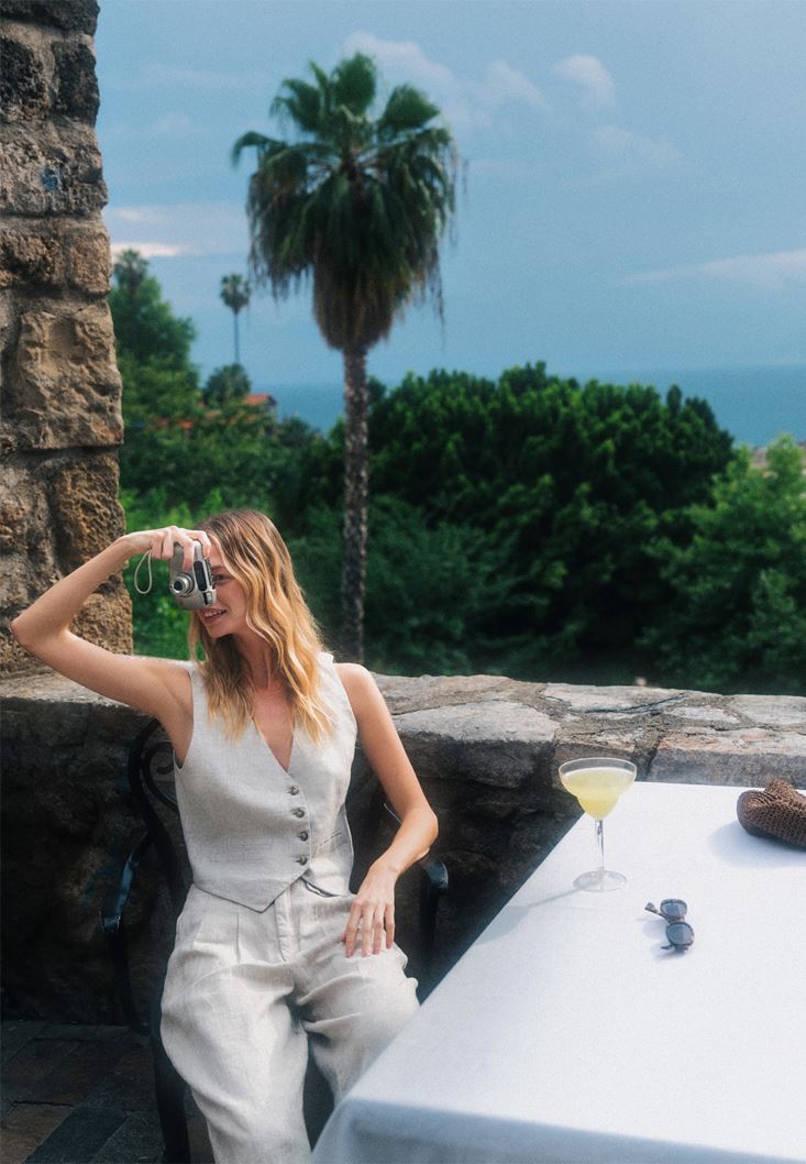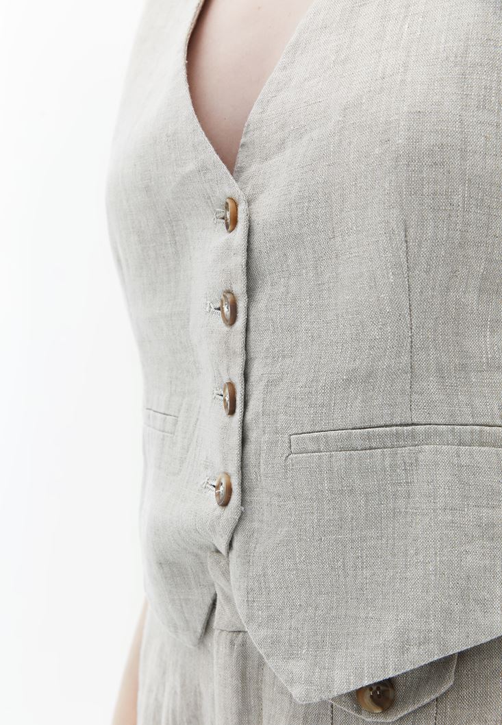 %100 keten içerikli doku, nem transferi sağlayan kumaş, V yaka, crop kesim, bedene yakın fit, düğme kapamalı.