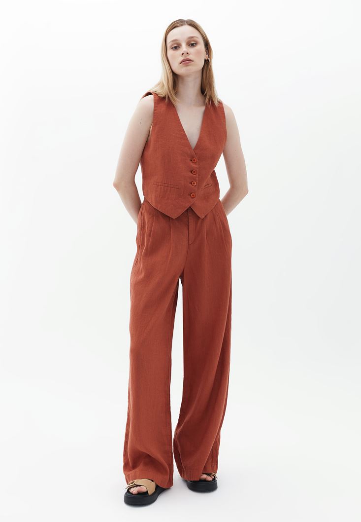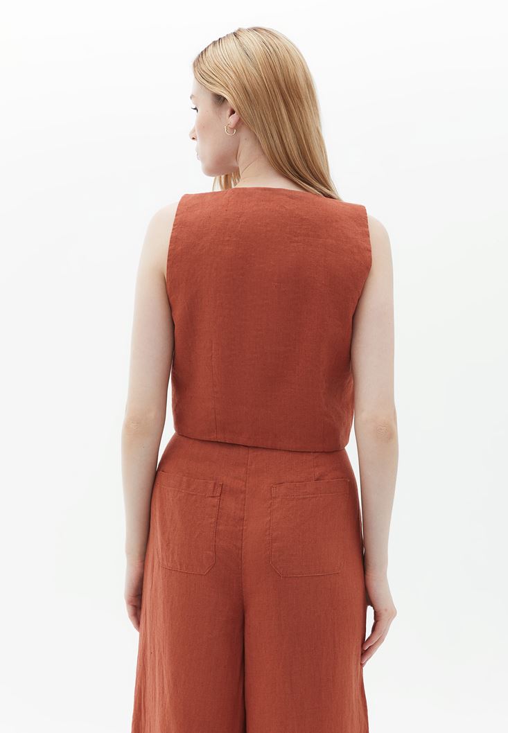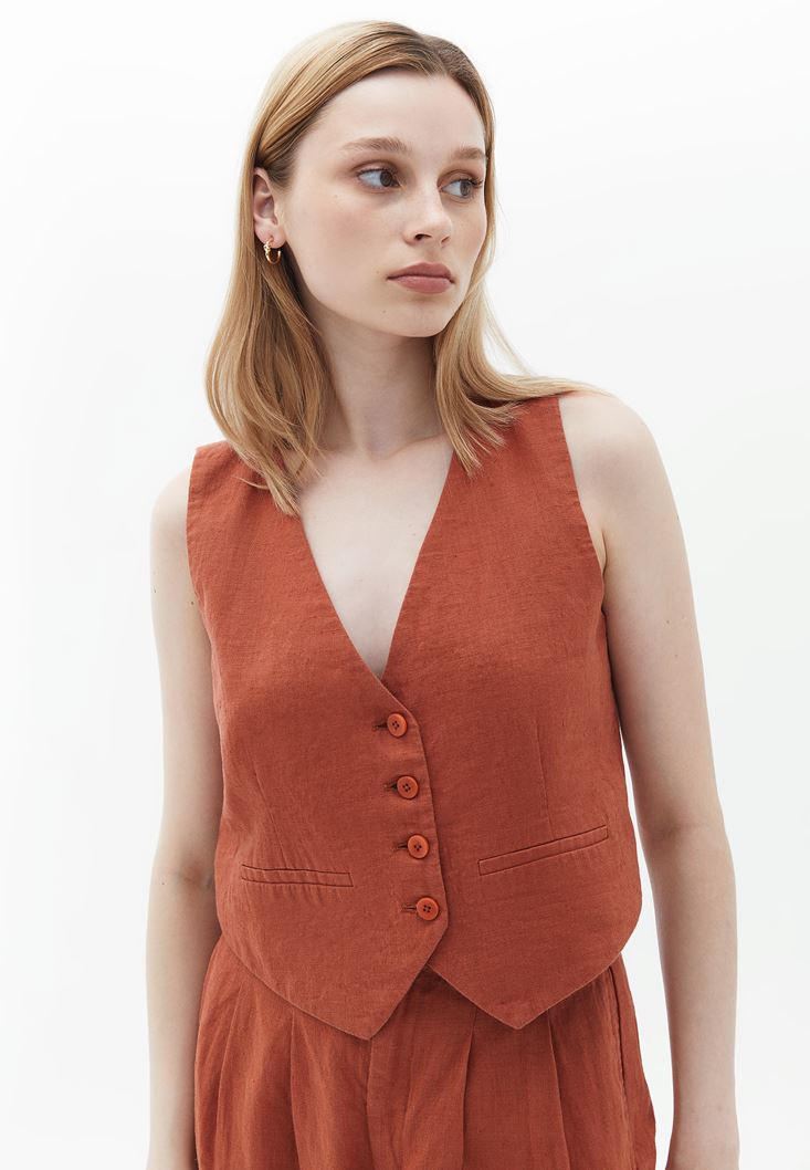 %100 keten içerikli doğal doku, V yaka, bedene yakın fit, düğme kapamalı, crop kesim.
