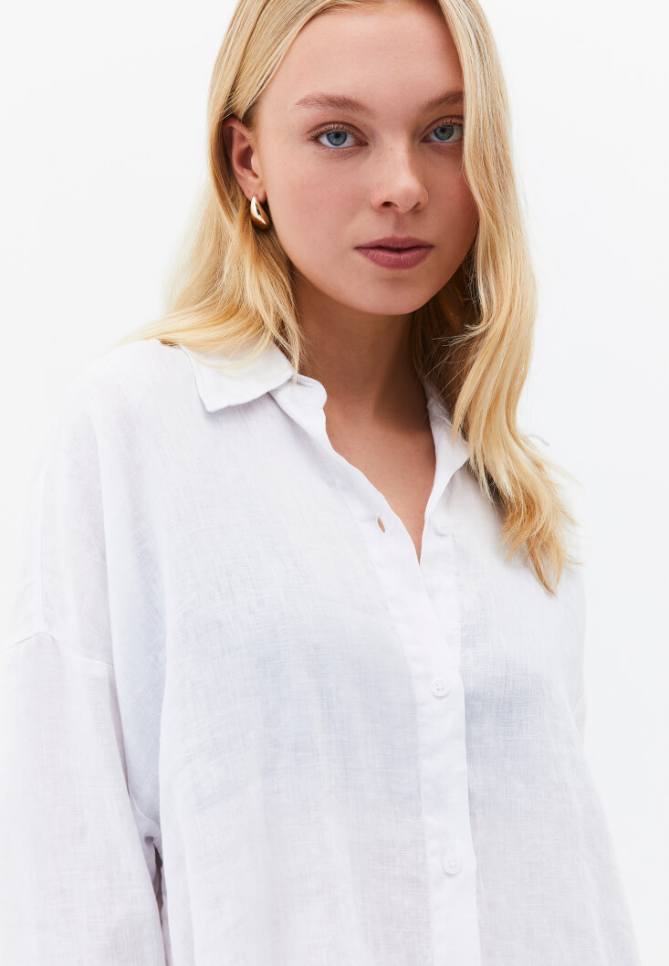 Beyaz Keten Düğmeli Gömlek