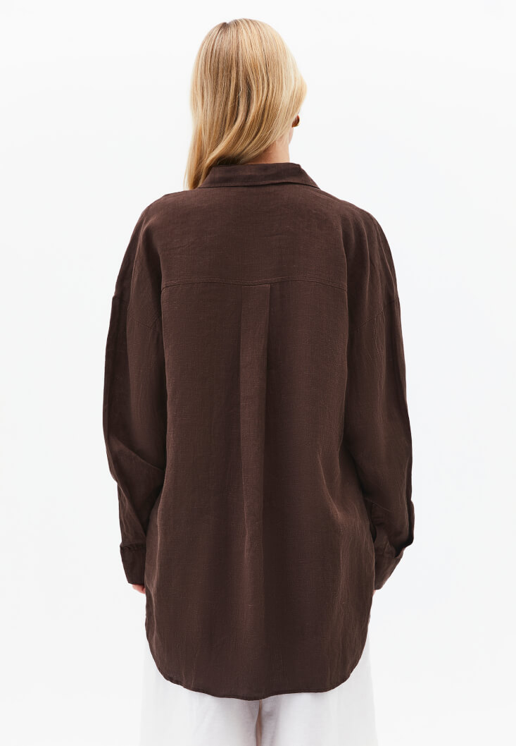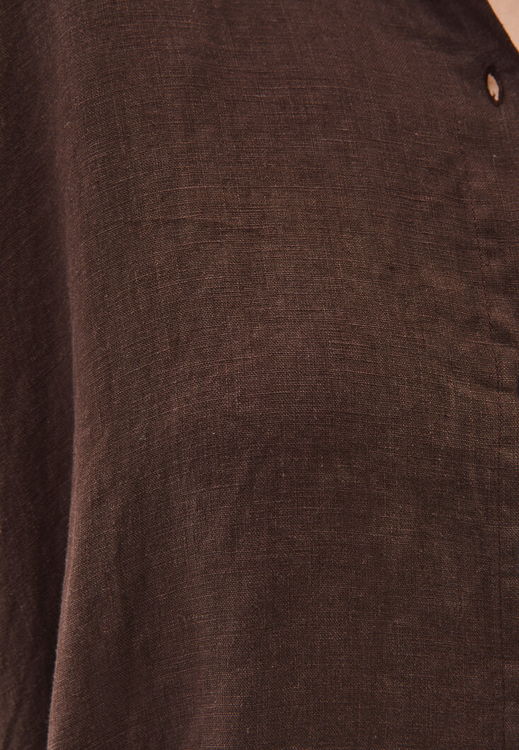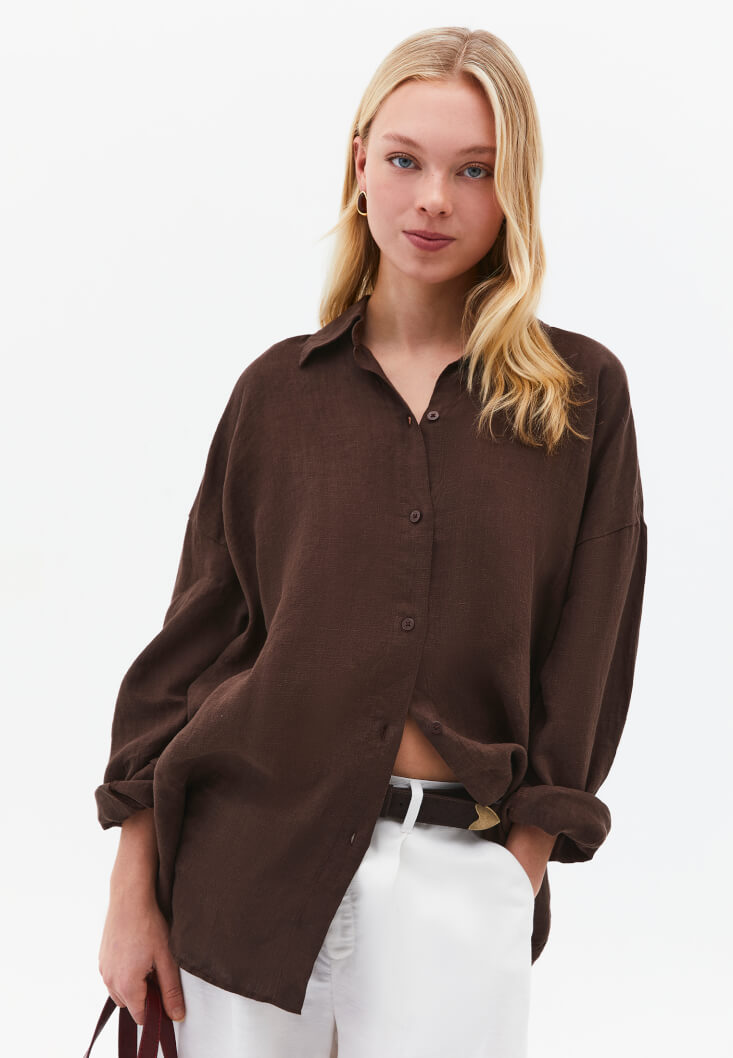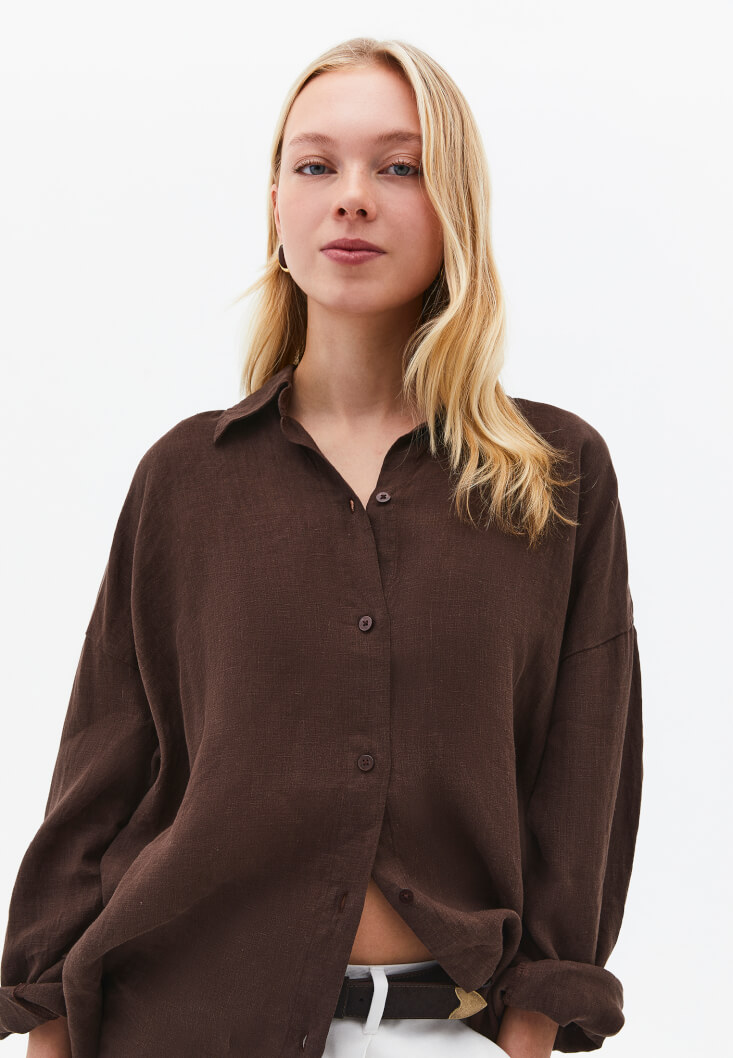 • Bayan Kahverengi Keten Düğmeli Gömlek