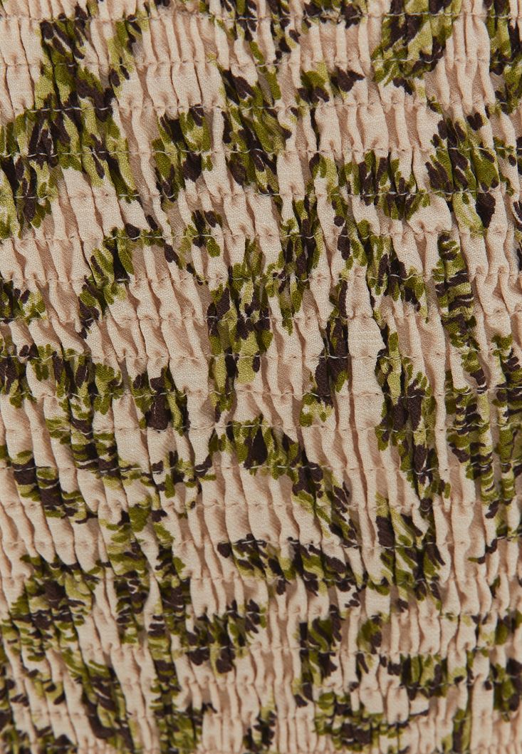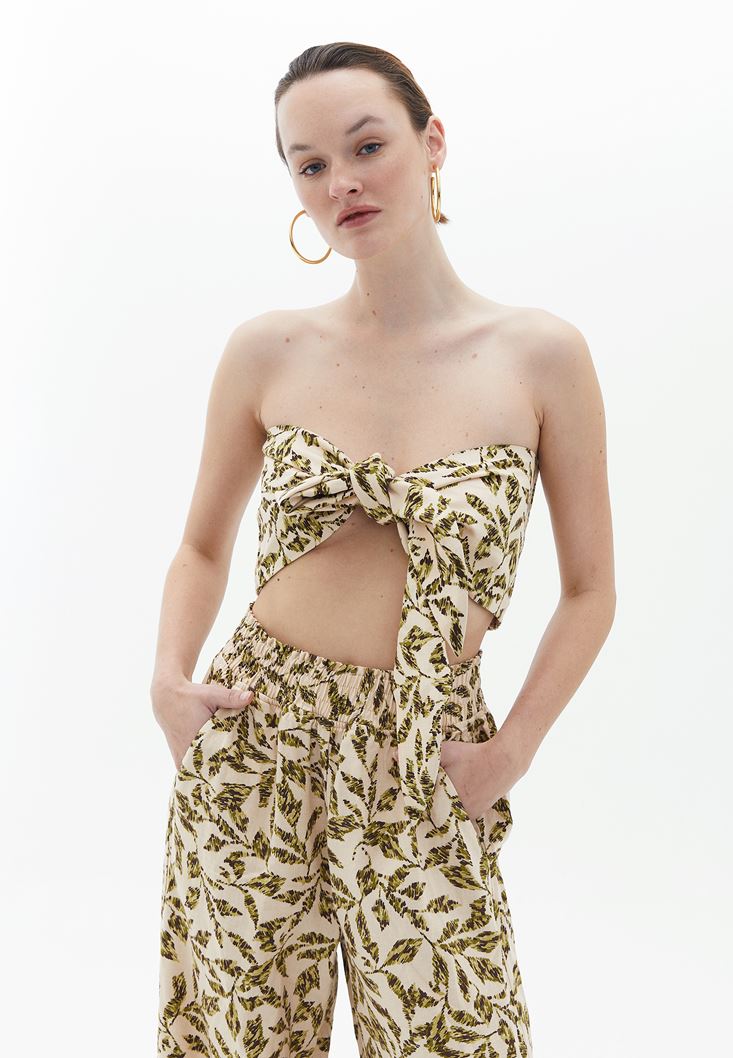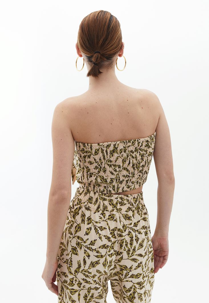 Keten, pamuk ve viskon karışımlı doğal içerik, nefes alabilen kumaş, yaprak desenli tasarım, bedeni saran fit, straplez, sırt kısmı esnek gipeli, ön bölümü bağlama detaylı.