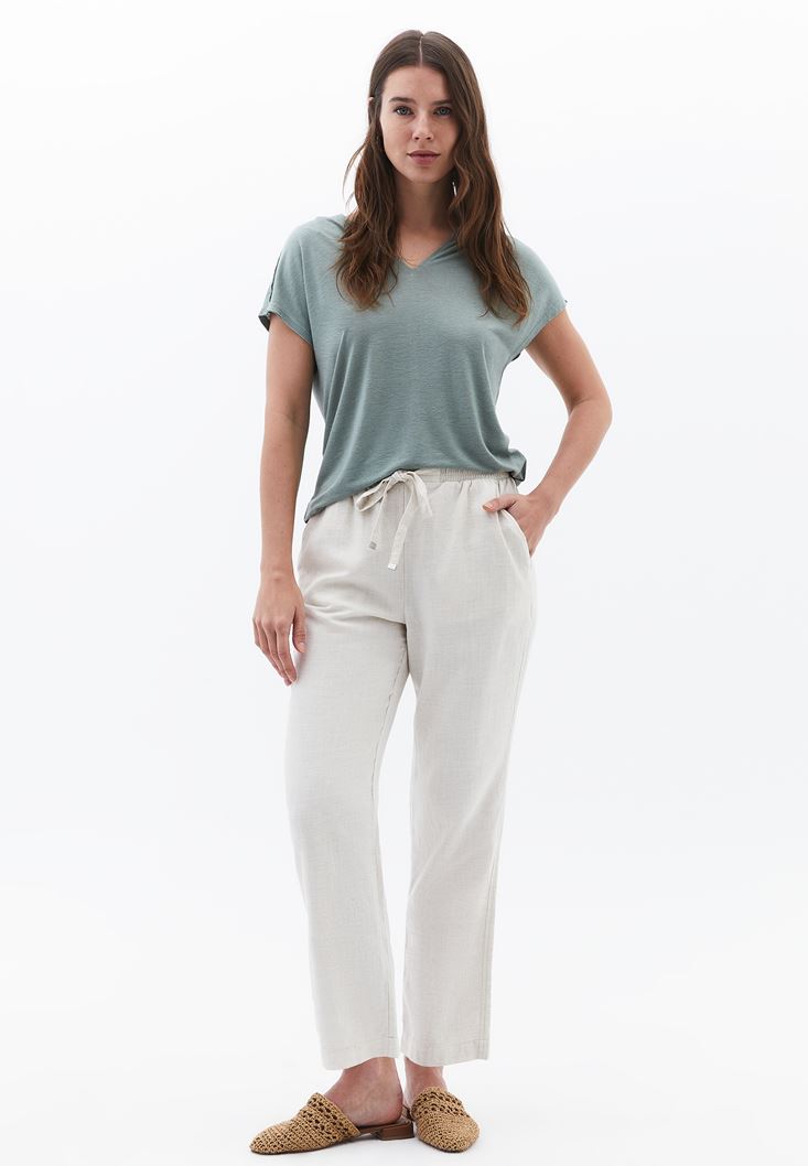 • Bayan Bej Keten Karışımlı Carrot-Fit Pantolon