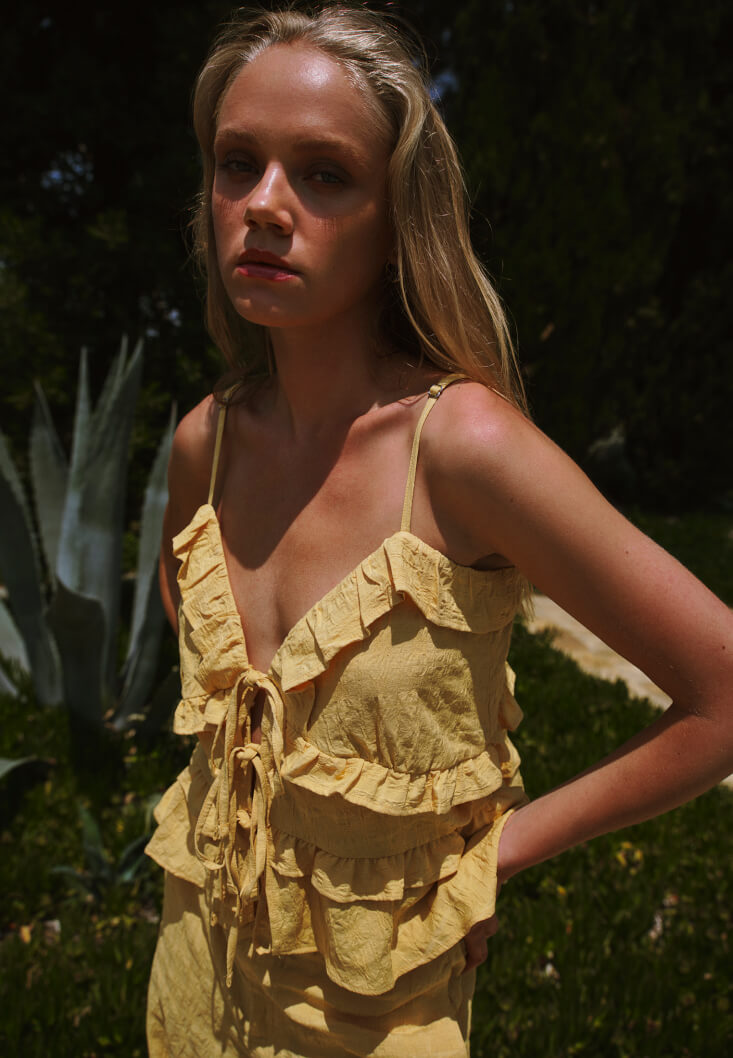 Yazın enerjisini yansıtan bu keten karışımlı bluz, hafif ve nefes alabilir yapısıyla gün boyu konfor sunarken fırfır detaylarıyla feminen bir görünüm kazandırıyor. Askılı formu sıcak havalar için ideal bir seçenek olurken, dökümlü duruşu stilinize zarif bir hareket katıyor.