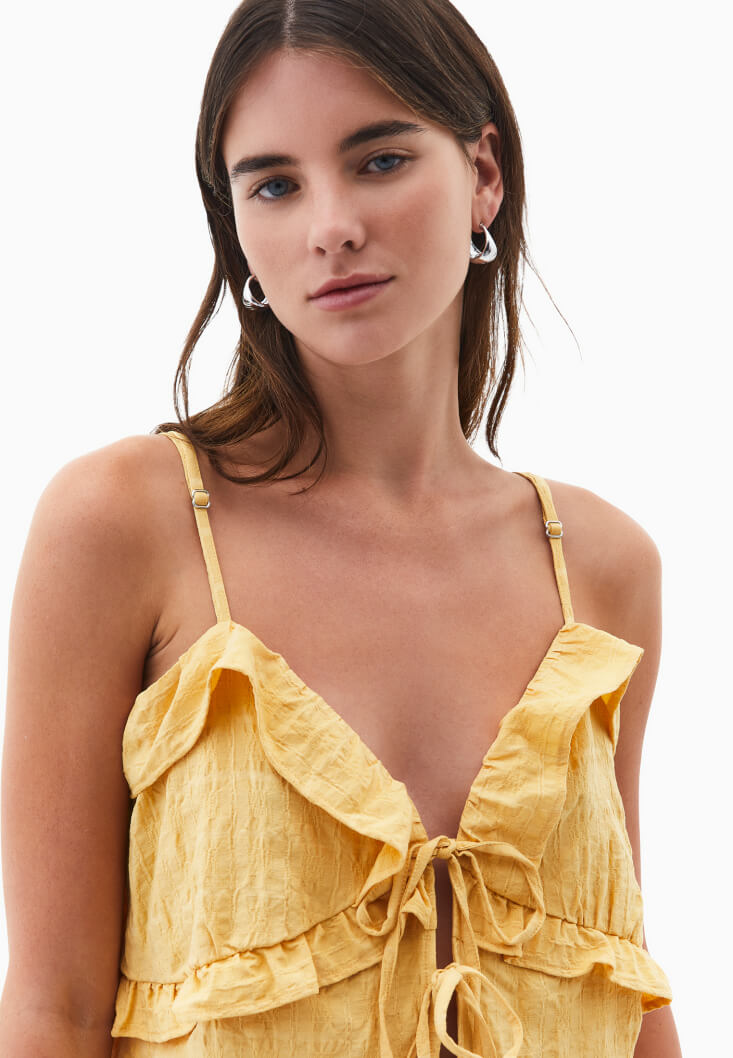 Keten ve viskon karışımlı özel doku, bedenden uzak loose fit, ayarlanabilir ince askılı, katlı fırfır tasarımlı, V yaka, ön kısmı bağcık detaylı.