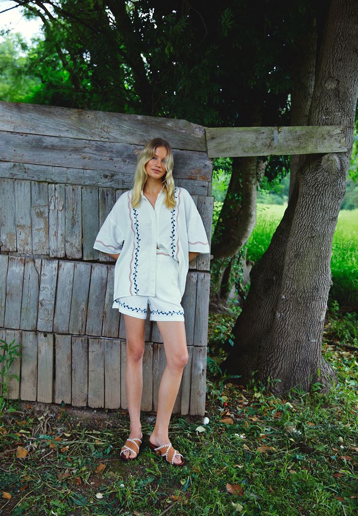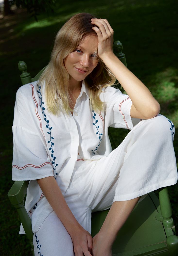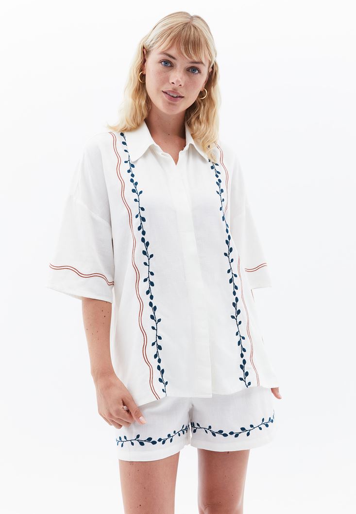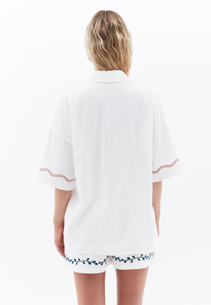 Keten, pamuk ve viskon içerikli doğal doku, beden boyunca nakış detaylı, kısa kollu, bedenden uzak loose fit, gizli düğme kapamalı.