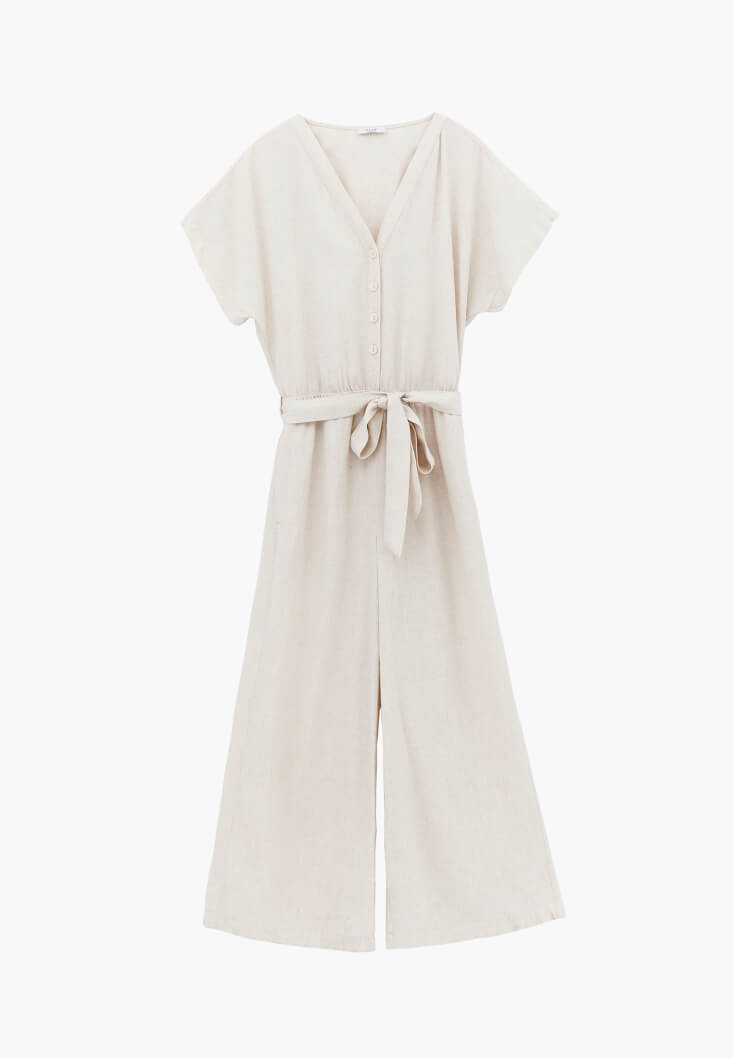 • Bayan Bej Keten Karışımlı Kemerli Tulum