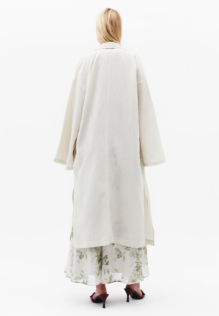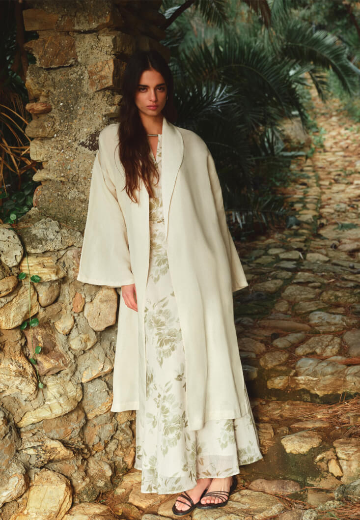 Yüksek kaliteli TENCEL™ ve keten doku, doğallığın sunduğu tüm ferahlığı her dokunuşta hissetmenizi sağarken; kimononun ikonik dökümlü kesimi silüetinize anında karakteristik bir derinlik ve hacimli bir asalet kazandırır. Doğal içeriğiyle doğallığa yapılan bu güçlü vurgu, parçaya hem sürdürülebilir bir değer hem de zamansız bir güç katıyor.