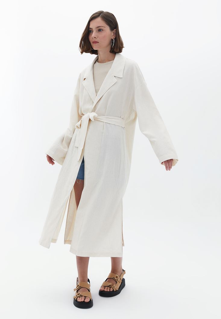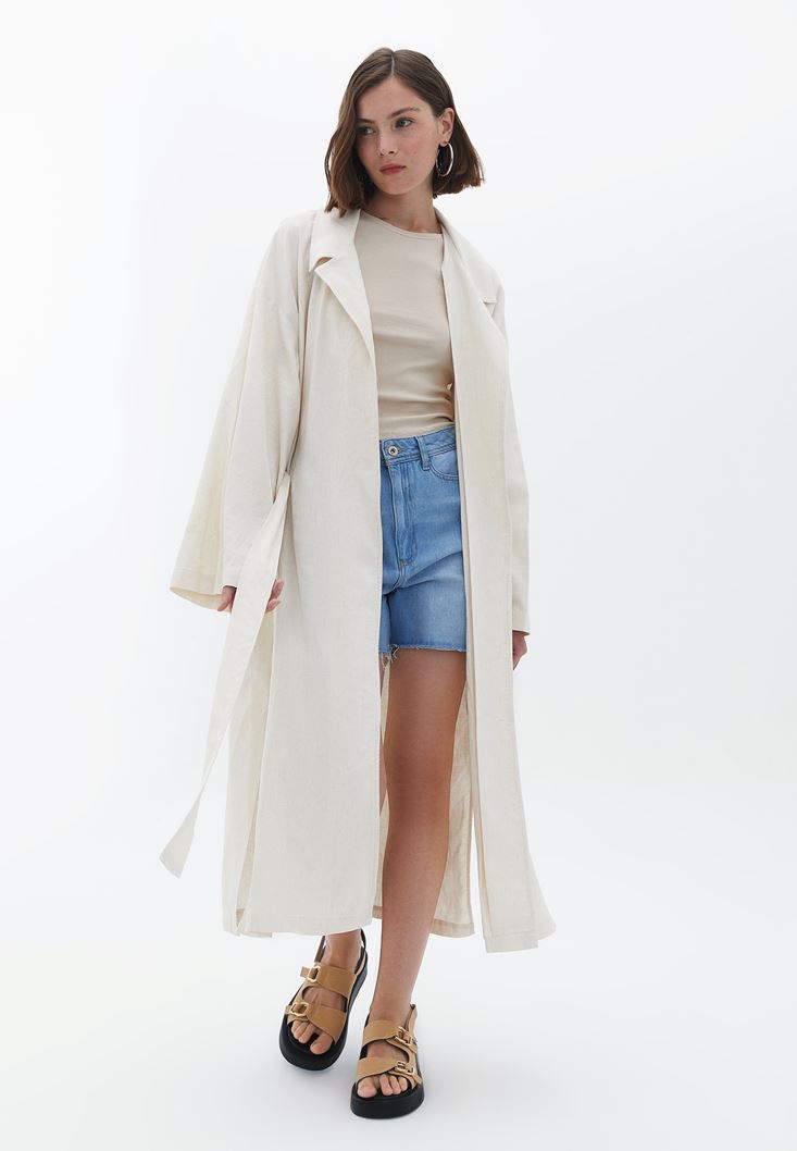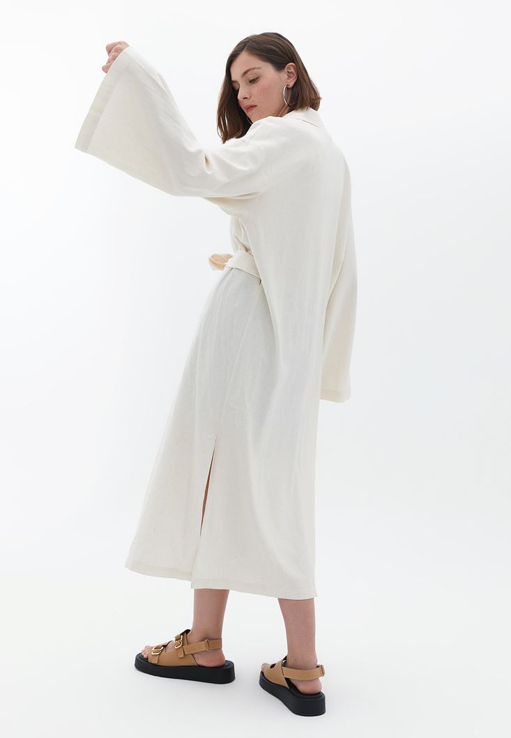 Bej Keten Karışımlı Midi Kimono