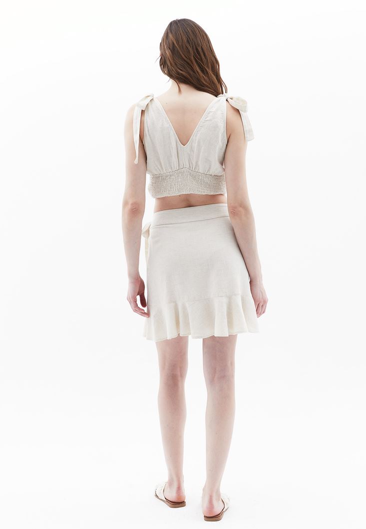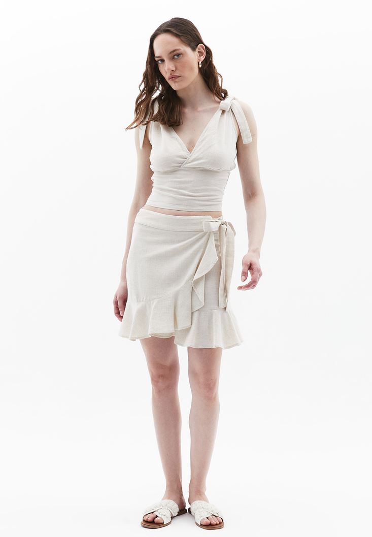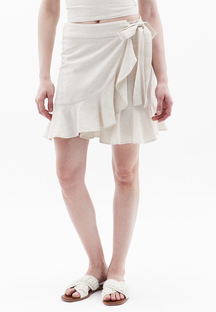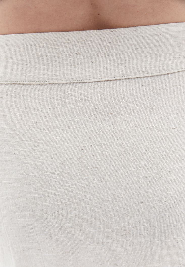 Bej Keten Karışımlı Mini Etek