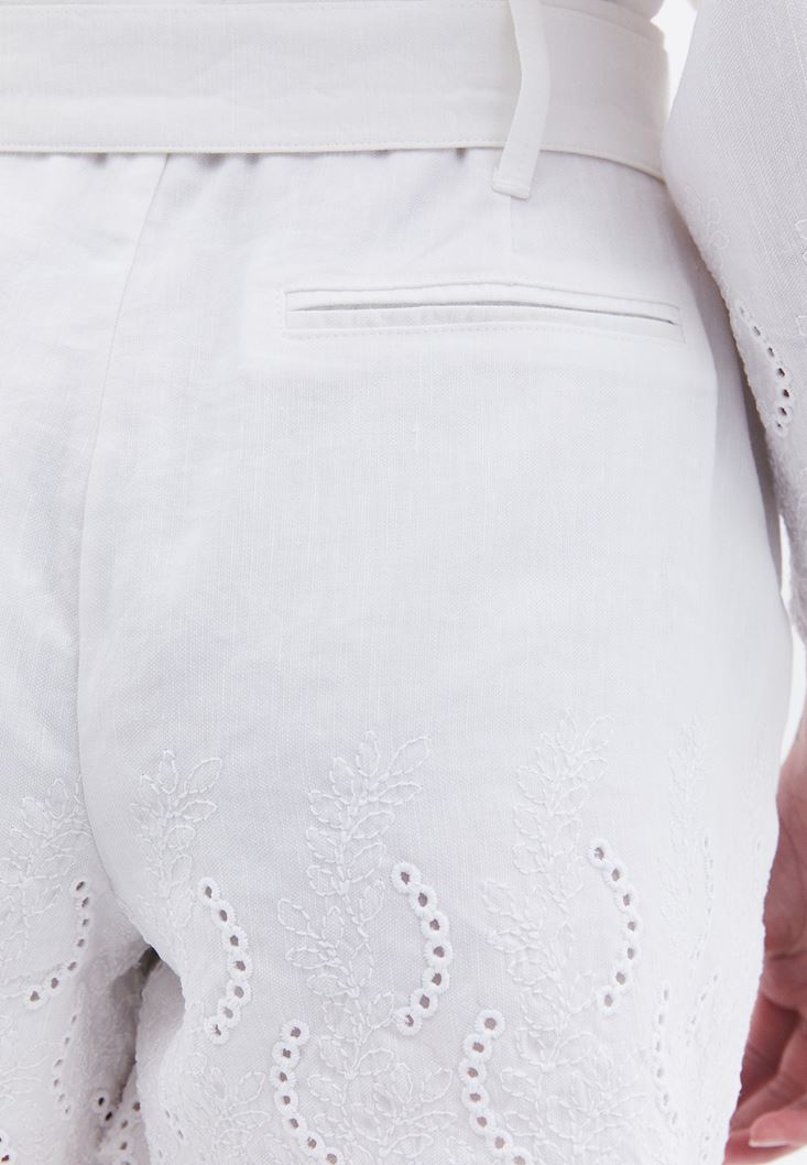 Tencel(Lyocell) ve keten karışımlı doğal içerik, ultra yüksek bel, kendi kumaşından kemerli, paça kısmı nakış detaylı, iki cepli, bedenden uzak rahat fit, kısa boy kesim, içi astarlı.