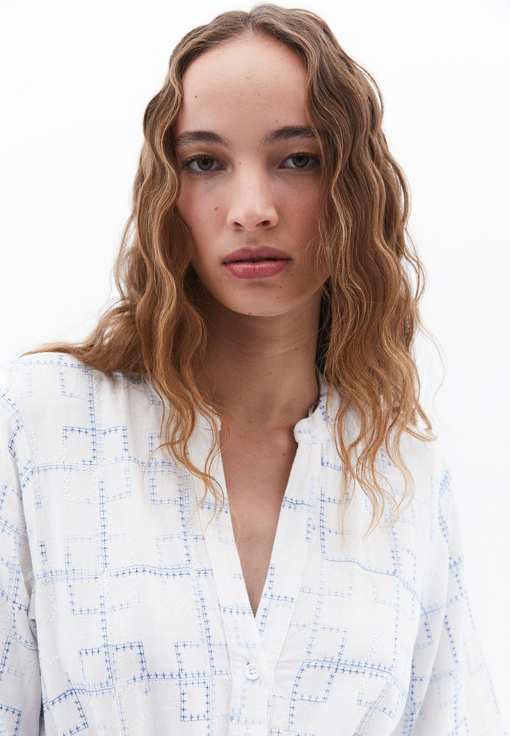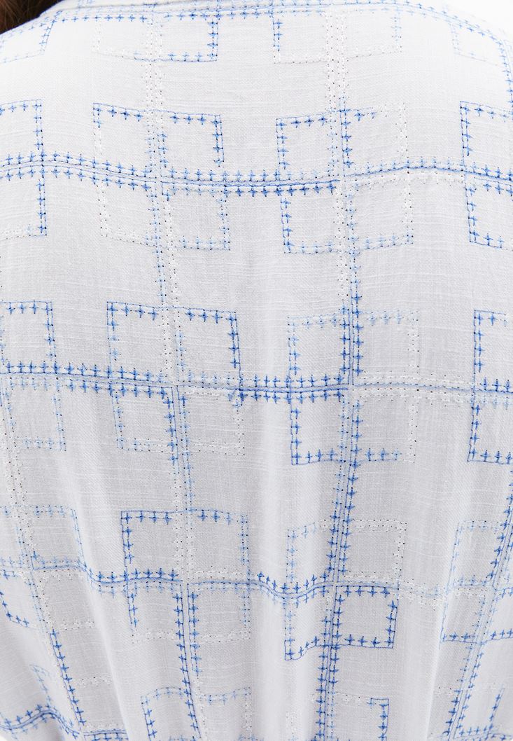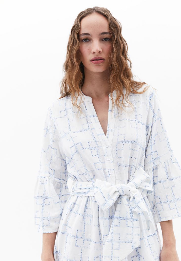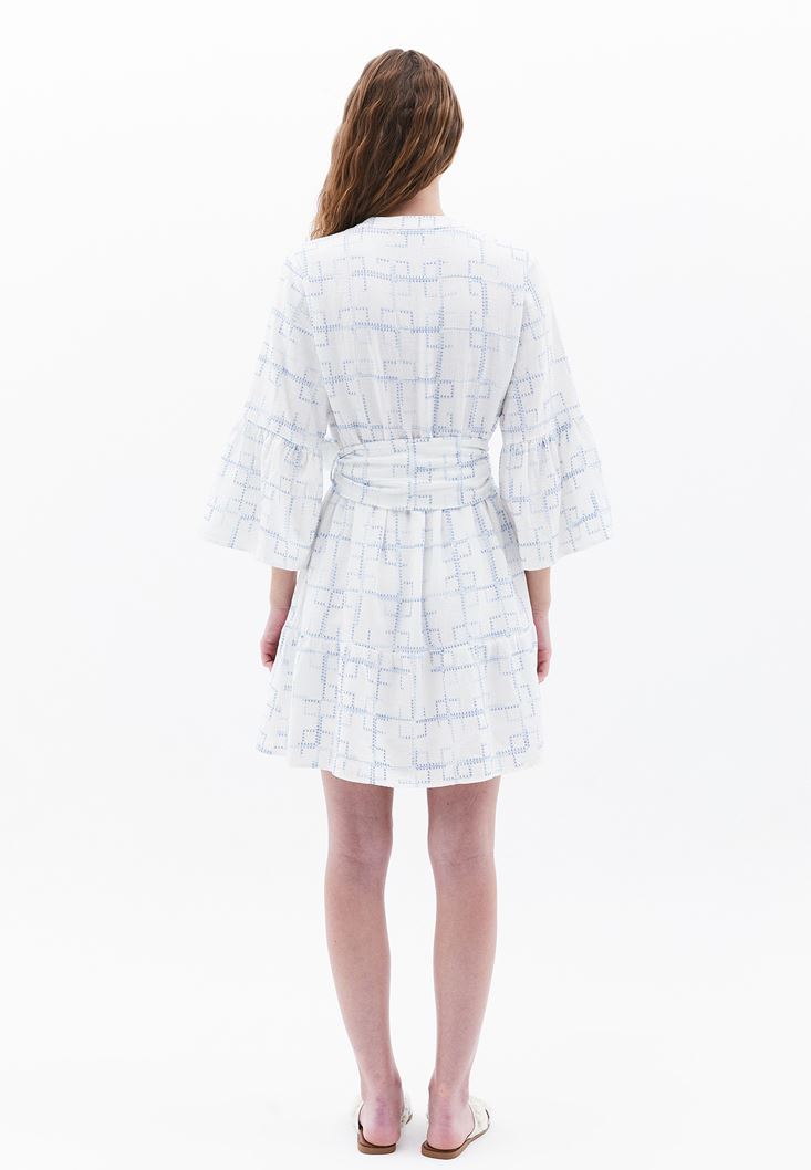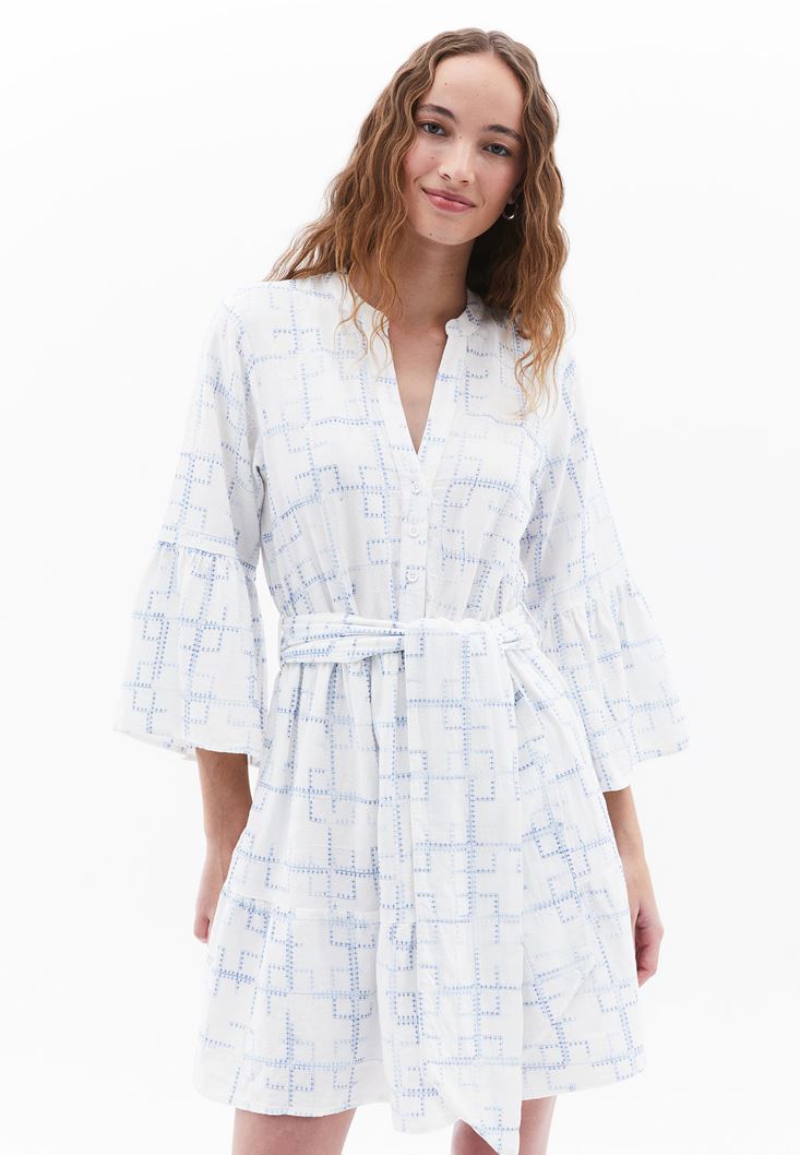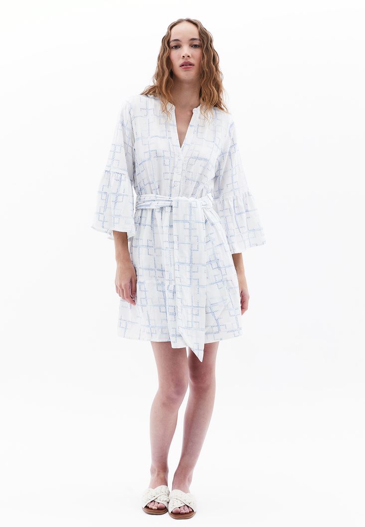 Keten, pamuk ve viskon karışımlı doğal doku, kendi kumaşından kuşaklı, geometrik desenli, yarım kollu, mini kesim, düğme kapamalı, hakim yaka, kol ucu volanlı.