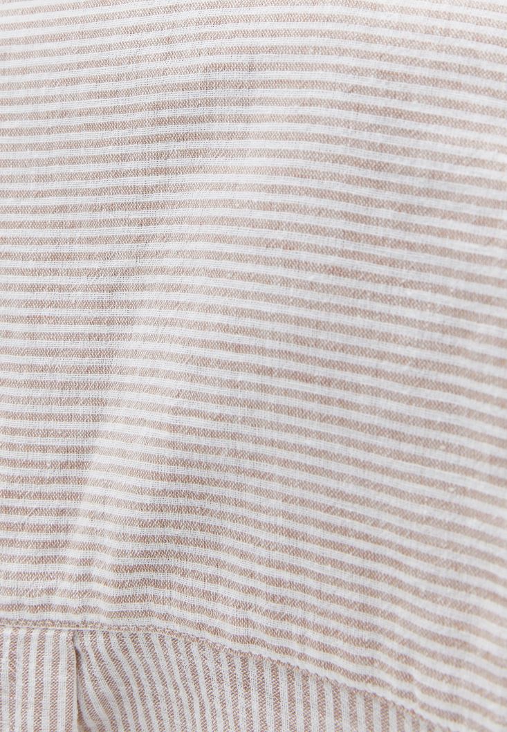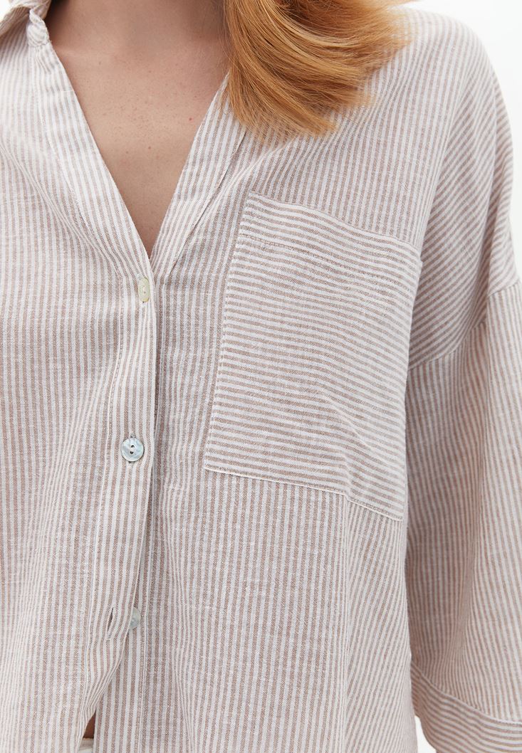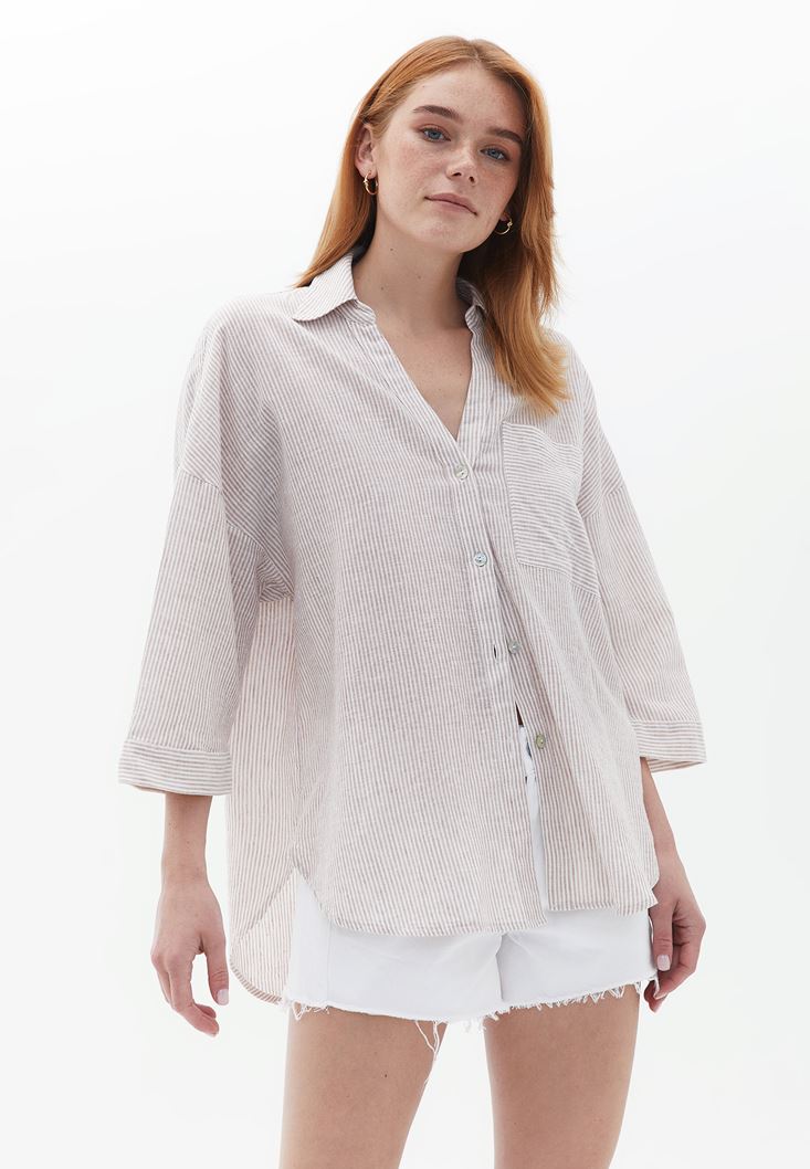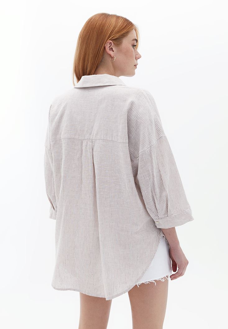 Keten ve pamuk karışımlı doğal içerik, nem transferi sağlayan kumaş, bedenden uzak oversize fit, yarım kollu, önü kısa arkası uzun asimetrik kesim, çizgi desenli, ön kısmı tek cepli.