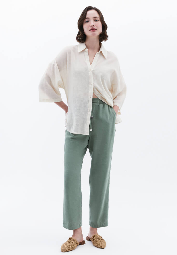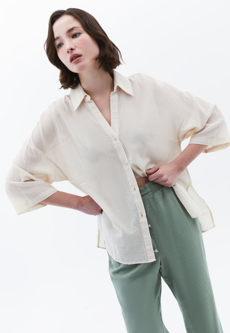 Bu oversize kesimli keten gömlek, doğallığı ve şıklığı bir arada sunarak her tarza uyum sağlıyor. Geniş kalıplı formu ve doğal içerikli dokusuyla, en sıcak yaz günlerinde bile hem ofis hem hafta sonu kombinleri için mükemmel bir seçenek olarak karşınıza çıkıyor.