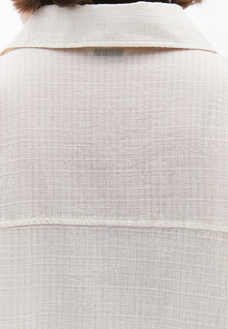 Keten ve pamuk içerikli doğal doku, bedenden uzak oversize fit, yarım kollu, düğme kapamalı, önü kısa arkası uzun asimetrik kesim.