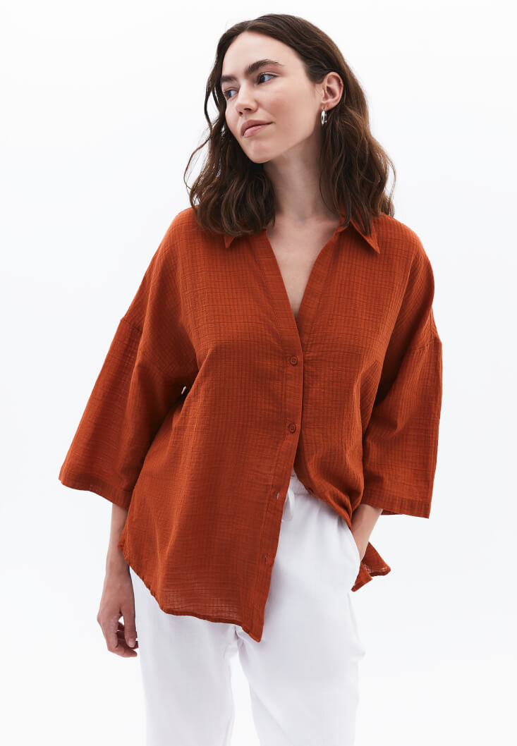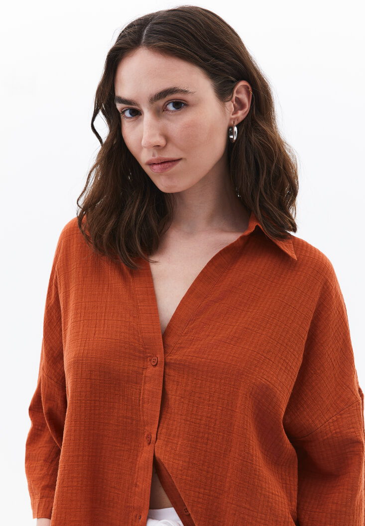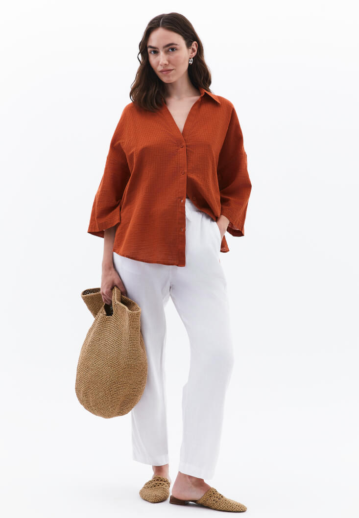 • Bayan Kiremit Keten Karışımlı Oversize Gömlek