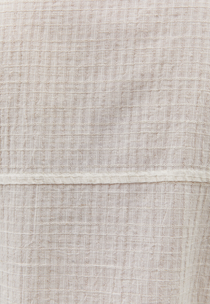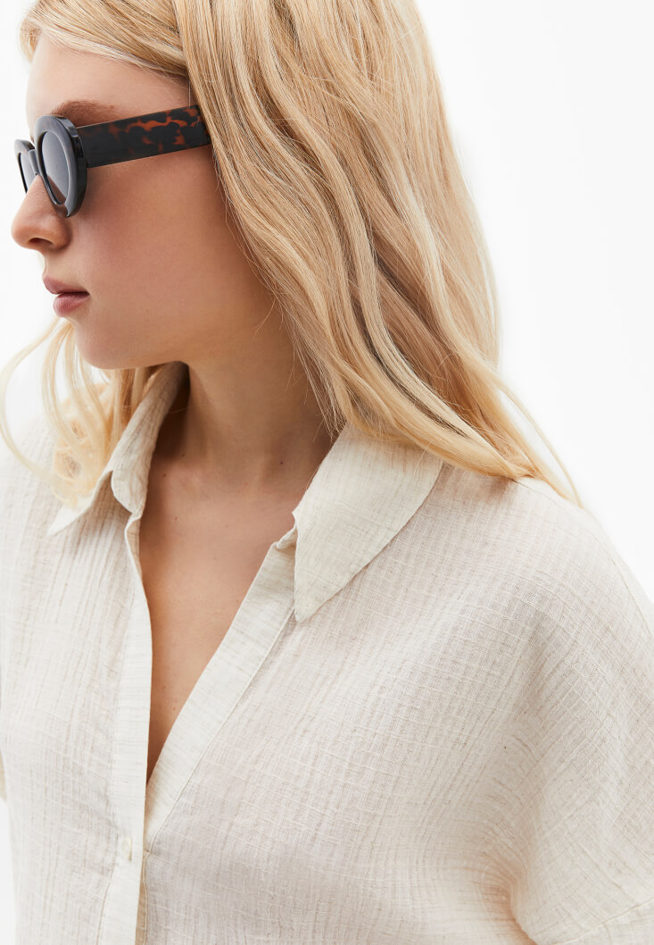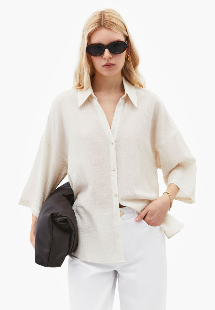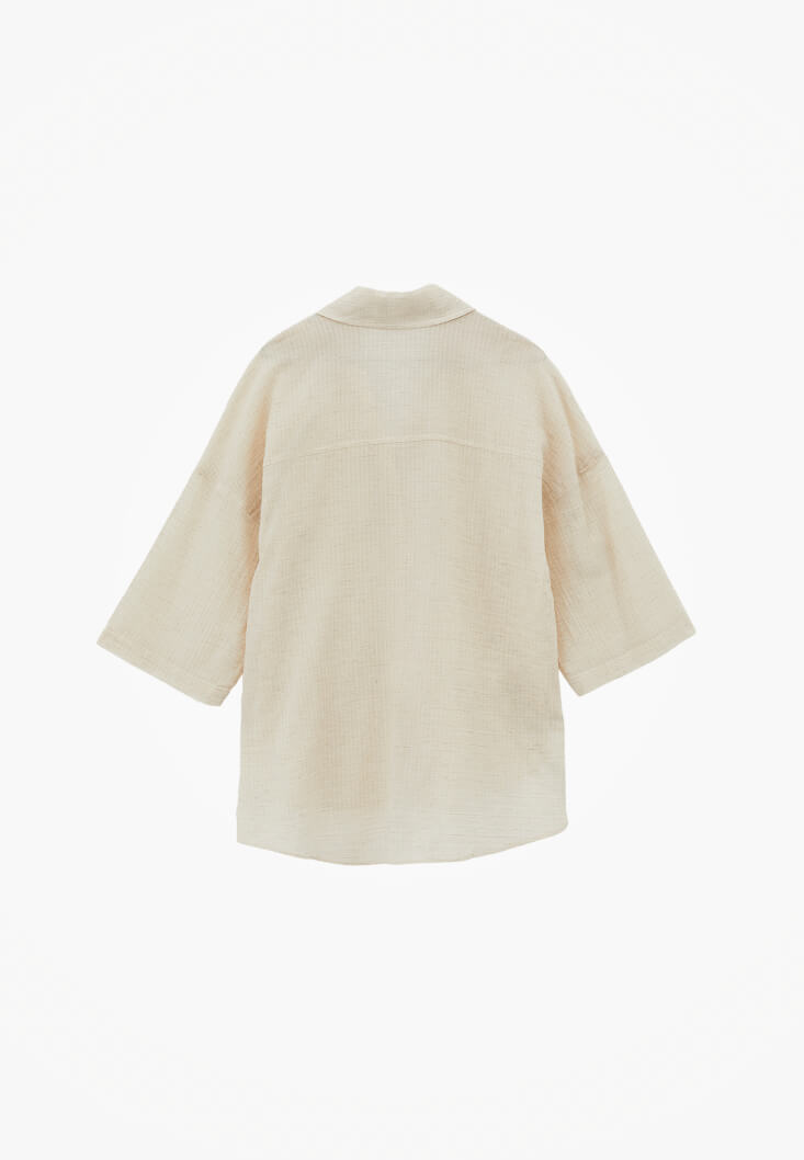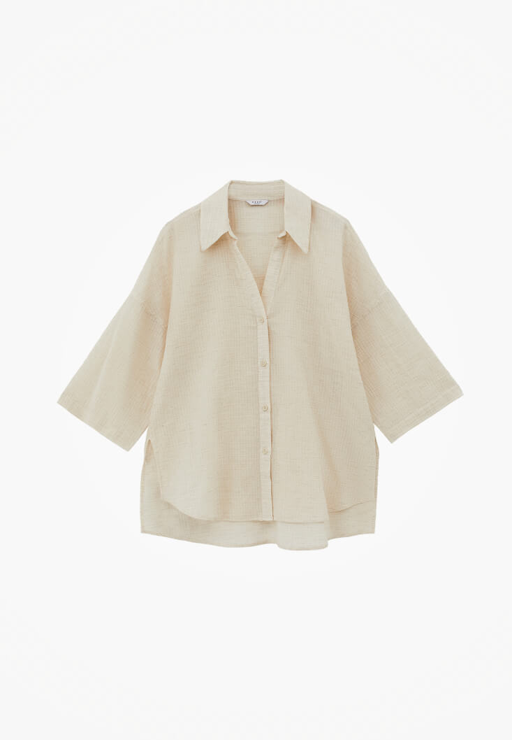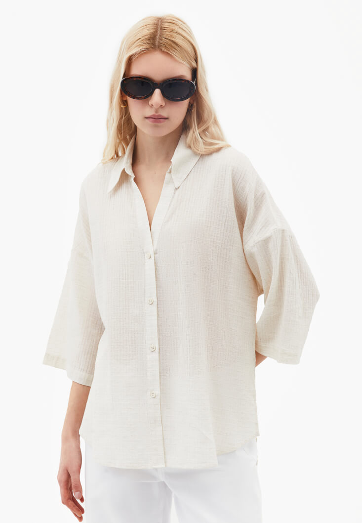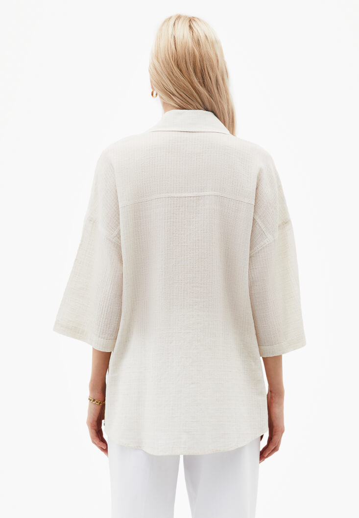 Pamuk ve keten karışımlı doğal içerik, bedenden uzak oversize fit, nefes alabilen kumaş, truvakar kol, düğme kapamalı, önü kısa arkası uzun asimetrik kesim.