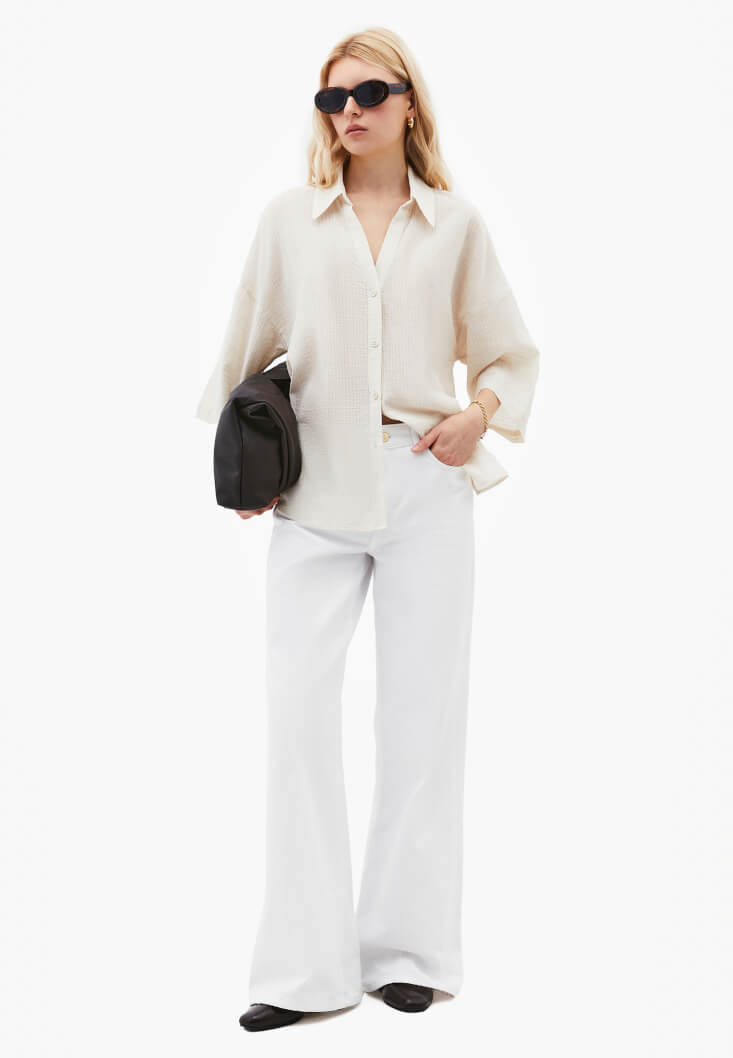 Bu hacimli tasarımı, bütünlük kurmak adına vücudu nazikçe saran orta bel triko etekler veya dökümlü modal wide-leg pantolonlarla eşleştirerek formlar arası bir diyalog kurgulayabilirsiniz. Görünümünüze modern bir katman eklemek isterseniz, içine halter yaka minimalist bir büstiyer giyip gömleğin önünü açık bırakarak eforsuz bir tavır sergileyin. Ayakkabı seçiminde sivri burunlu babetler veya deri terliklerle zarafetin dozunu artırırken; bel hattınızı geniş tokalı bir kemerle vurgulayıp burgu detaylı küpelerle silüetinizi mühürleyin. Hem sahil şeridindeki sakin yürüyüşlerde hem de şehrin rafine akşam buluşmalarında yanınızdan ayırmak istemeyeceğiniz bu parça, OXXO kadınının özgür ve doğal ruhunu temsil ediyor.