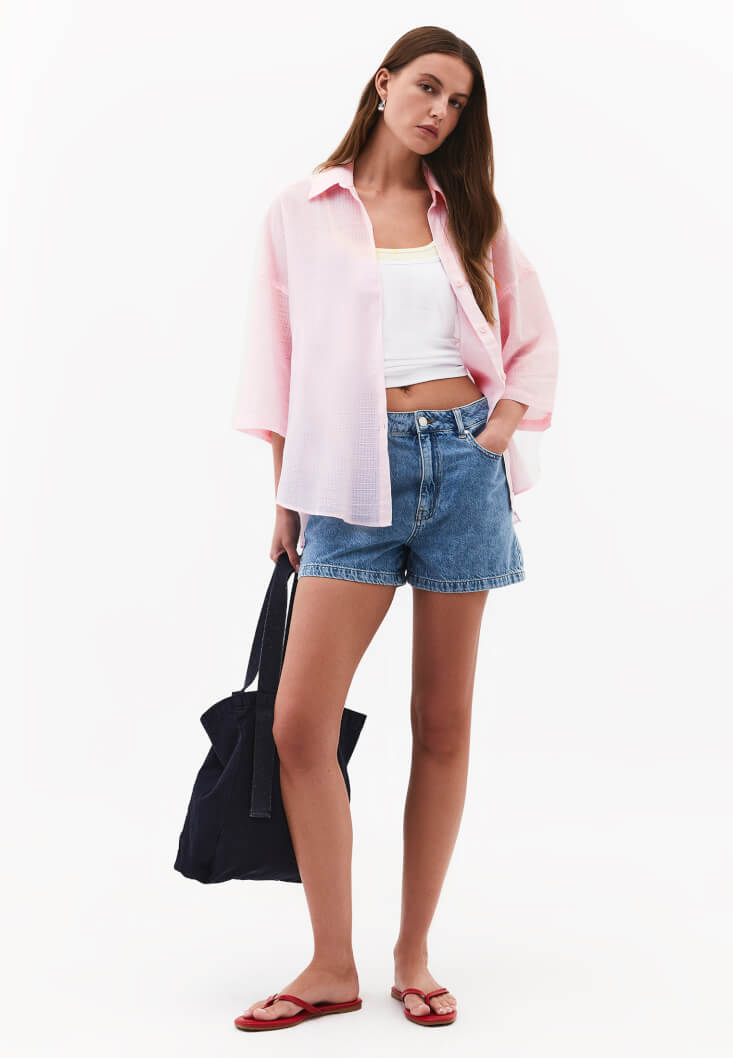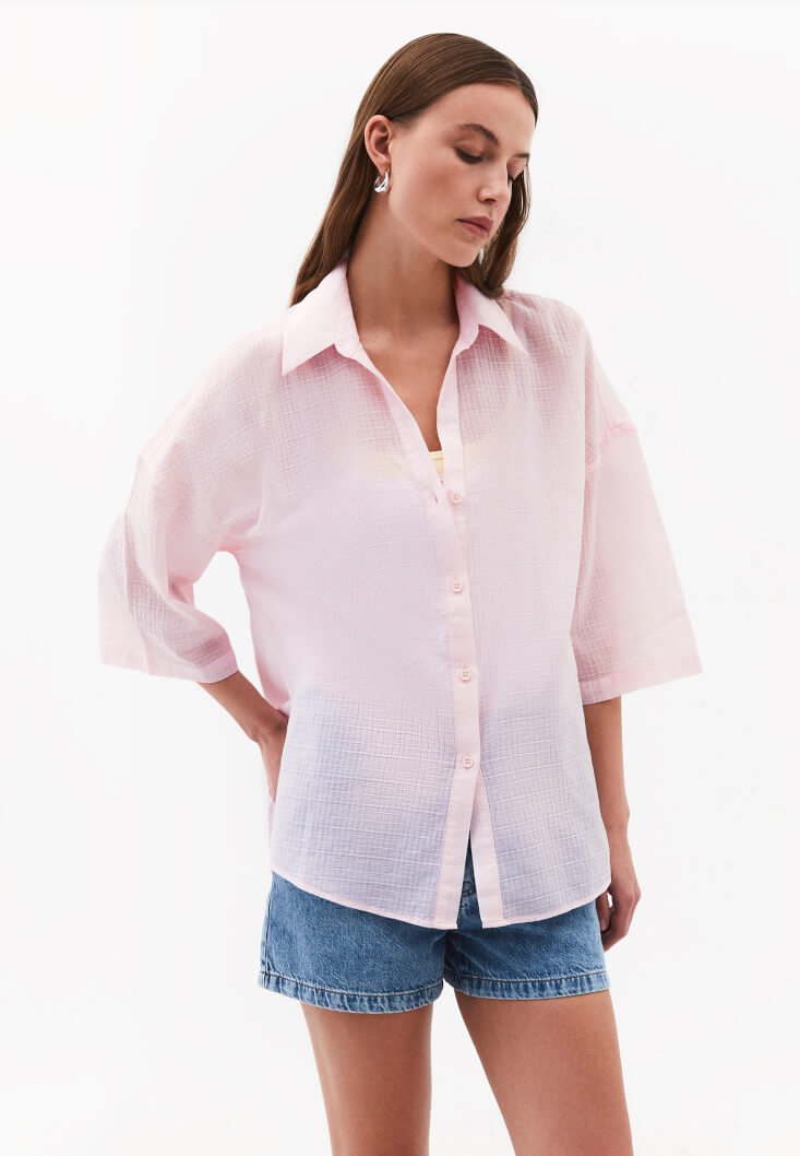 Bu hacimli tasarımı, bütünlük kurmak adına vücudu nazikçe saran orta bel triko etekler veya dökümlü modal wide-leg pantolonlarla eşleştirerek formlar arası bir diyalog kurgulayabilirsiniz. Görünümünüze modern bir katman eklemek isterseniz, içine halter yaka minimalist bir büstiyer giyip gömleğin önünü açık bırakarak eforsuz bir tavır sergileyin. Ayakkabı seçiminde sivri burunlu babetler veya deri terliklerle zarafetin dozunu artırırken; bel hattınızı geniş tokalı bir kemerle vurgulayıp burgu detaylı küpelerle silüetinizi mühürleyin. Hem sahil şeridindeki sakin yürüyüşlerde hem de şehrin rafine akşam buluşmalarında yanınızdan ayırmak istemeyeceğiniz bu parça, OXXO kadınının özgür ve doğal ruhunu temsil ediyor.