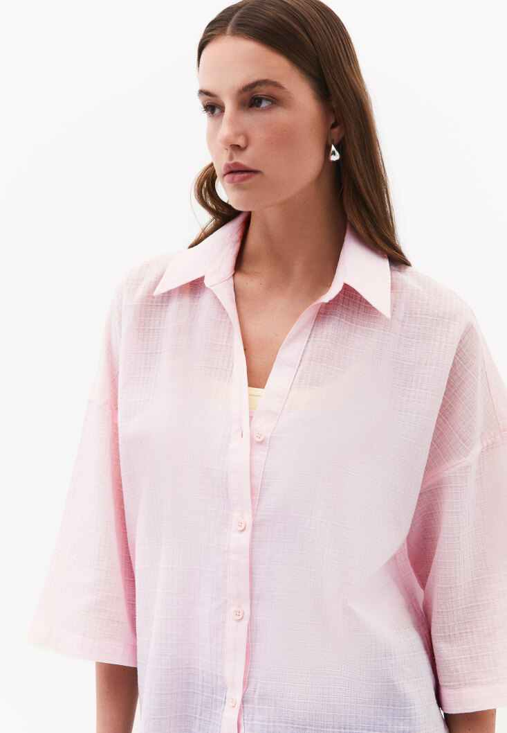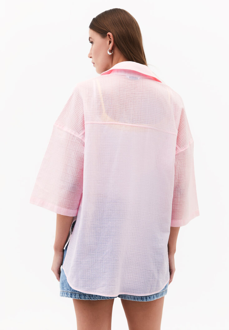 • Bayan Pembe Keten Karışımlı Oversize Gömlek