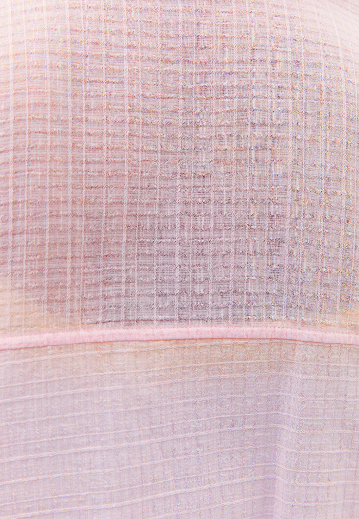 Pamuk ve keten karışımlı doğal içerik, bedenden uzak oversize fit, nefes alabilen kumaş, truvakar kol, düğme kapamalı, önü kısa arkası uzun asimetrik kesim.