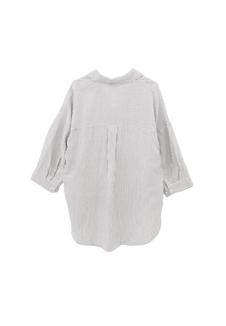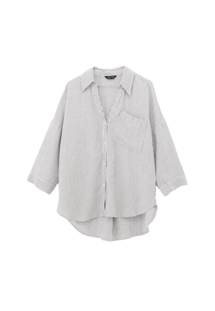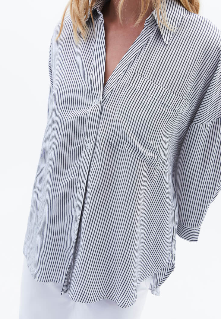 Keten ve viskon karışımlı doğal içerik, yumuşak dokulu, bedenden uzak oversize fit, yarım kollu, düğme kapamalı, tek cepli, çizgi desenli, önü kısa arkası uzun asimetrik kesim, sırt kısmı pile detaylı.