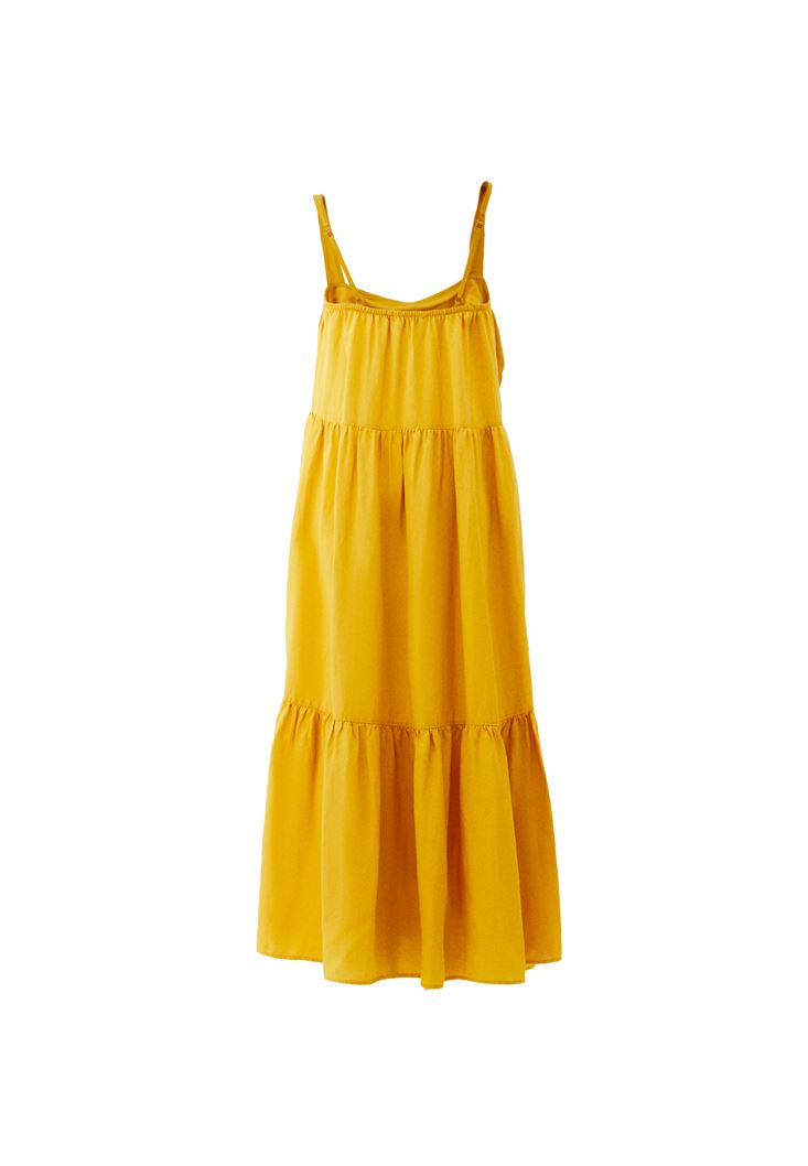 Viskon ve keten içerikli özel doku, bedenden uzak rahat fit, askılı tasarım, kare yaka, uzun kesim, katlı etek tasarımı, iki cepli.