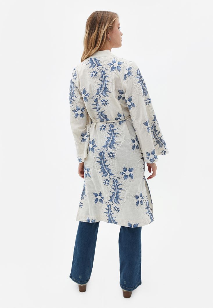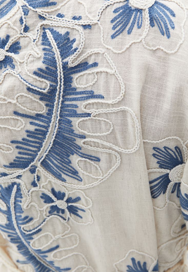 Keten ve pamuk karışımlı doğal içerik, bedenden uzak rahat fit, çiçek desenli, beli bağlama detaylı, ispanyol kol kesim, iki yanı yırtmaçlı.