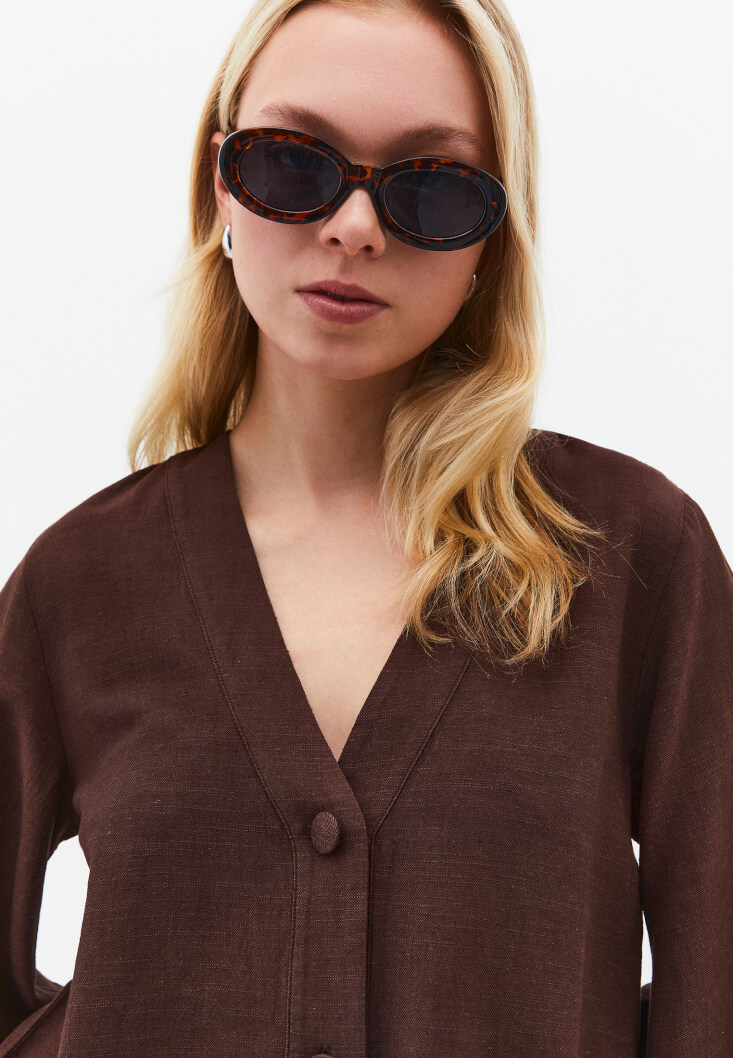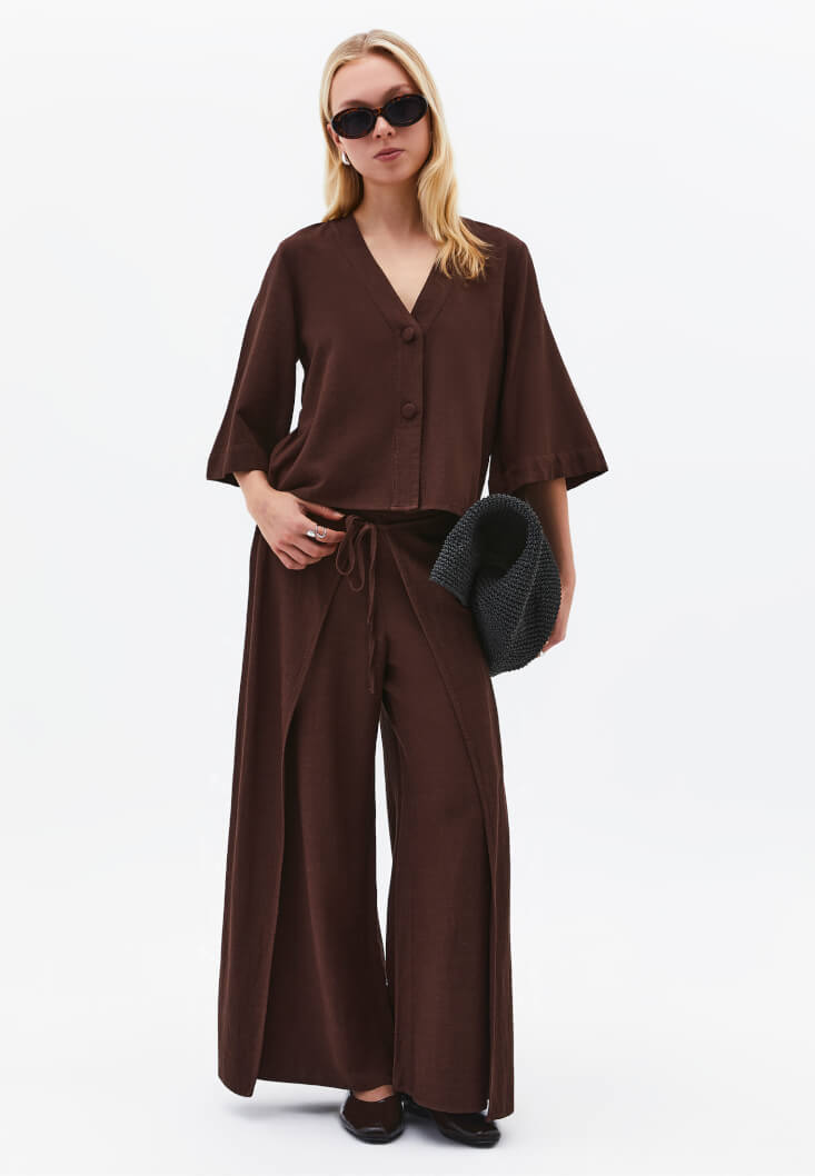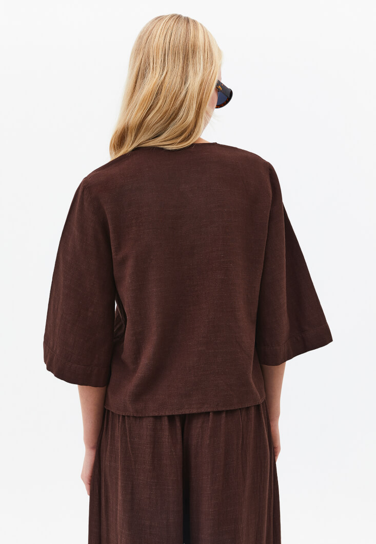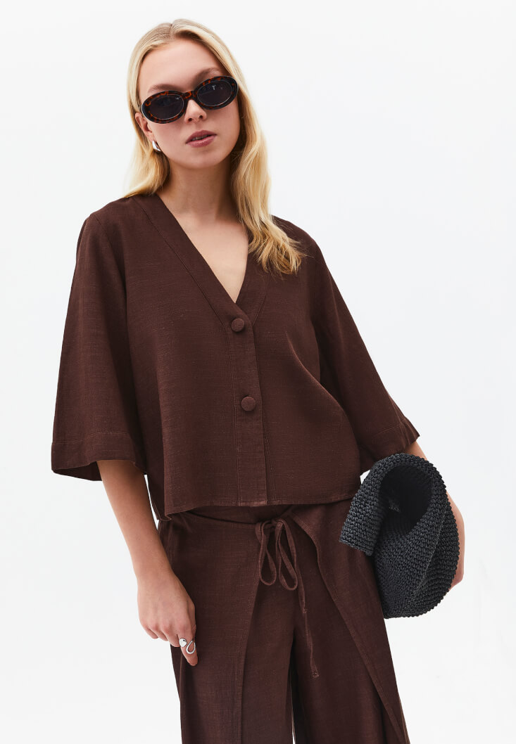 Kahverengi Keten Karışımlı V Yaka Bluz