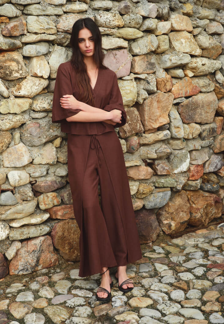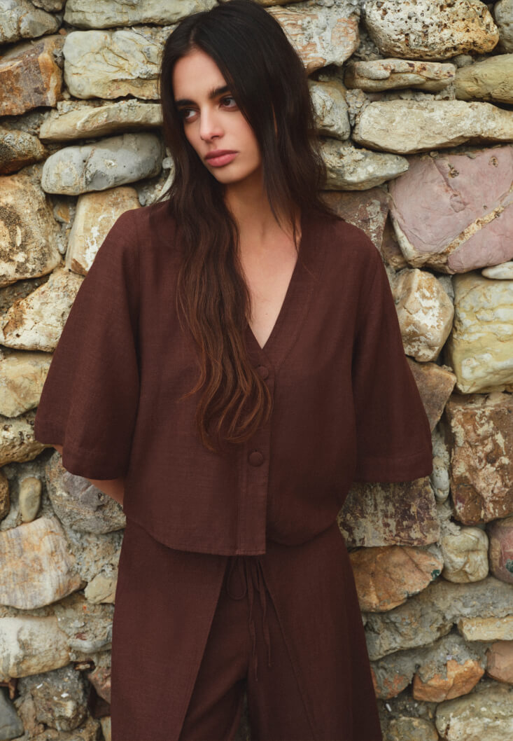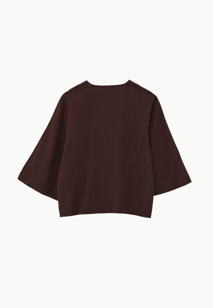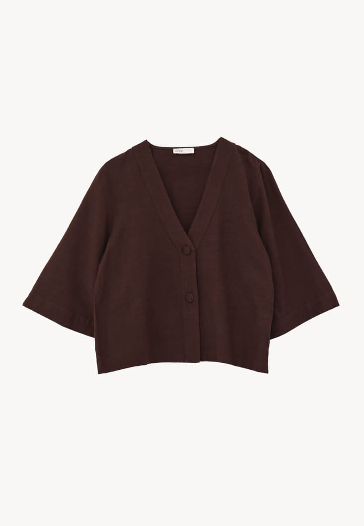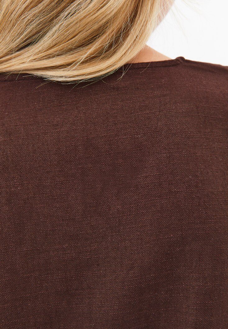 Kahverengi Keten Karışımlı V Yaka Bluz
