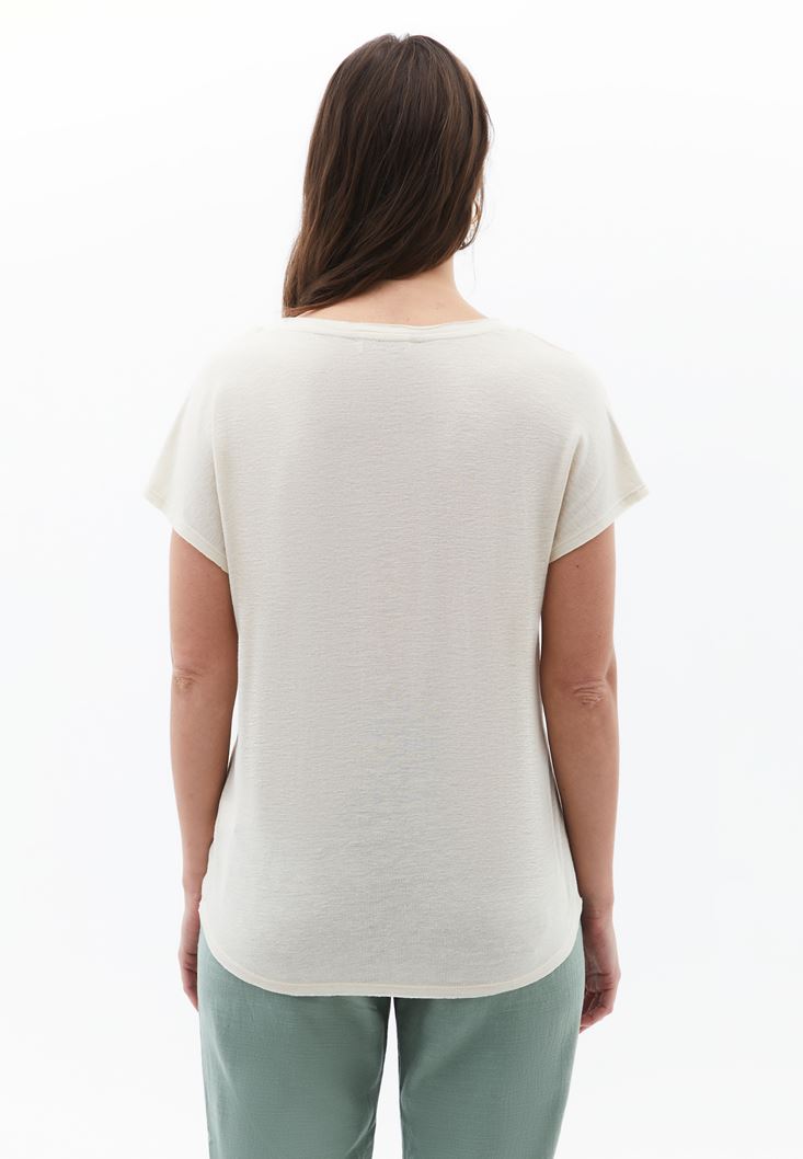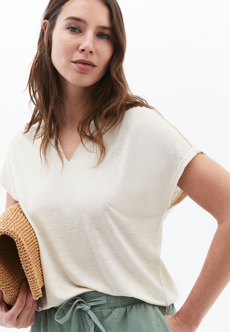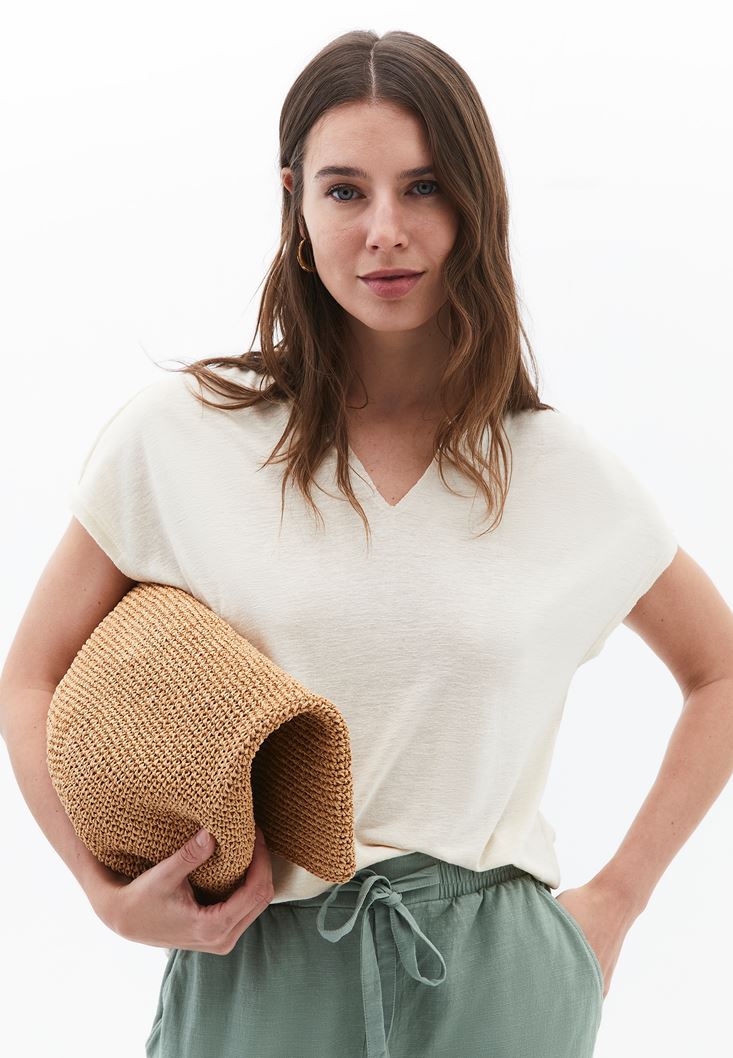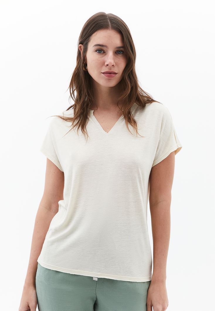 Krem Keten Karışımlı V Yaka Tişört