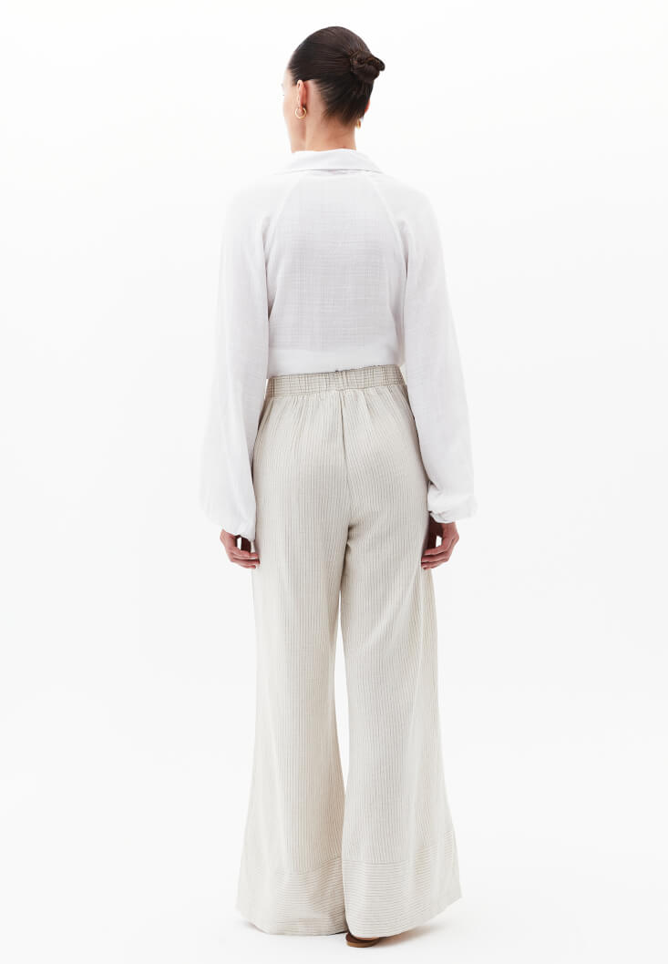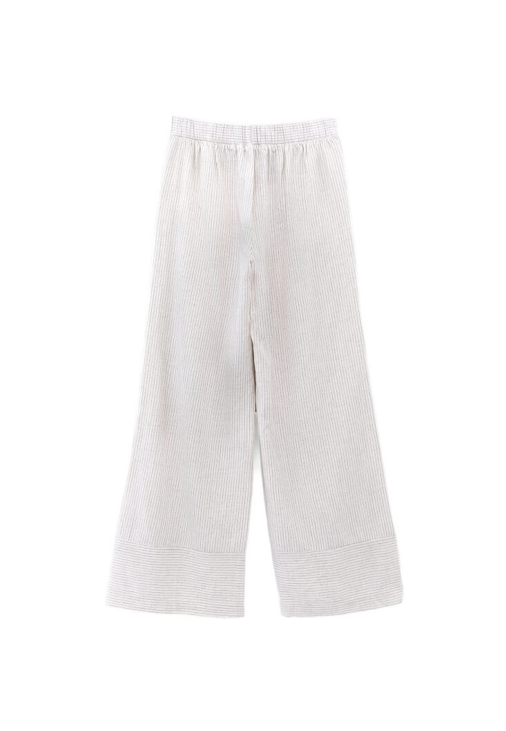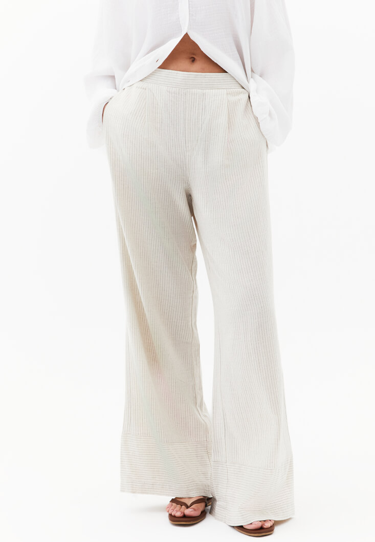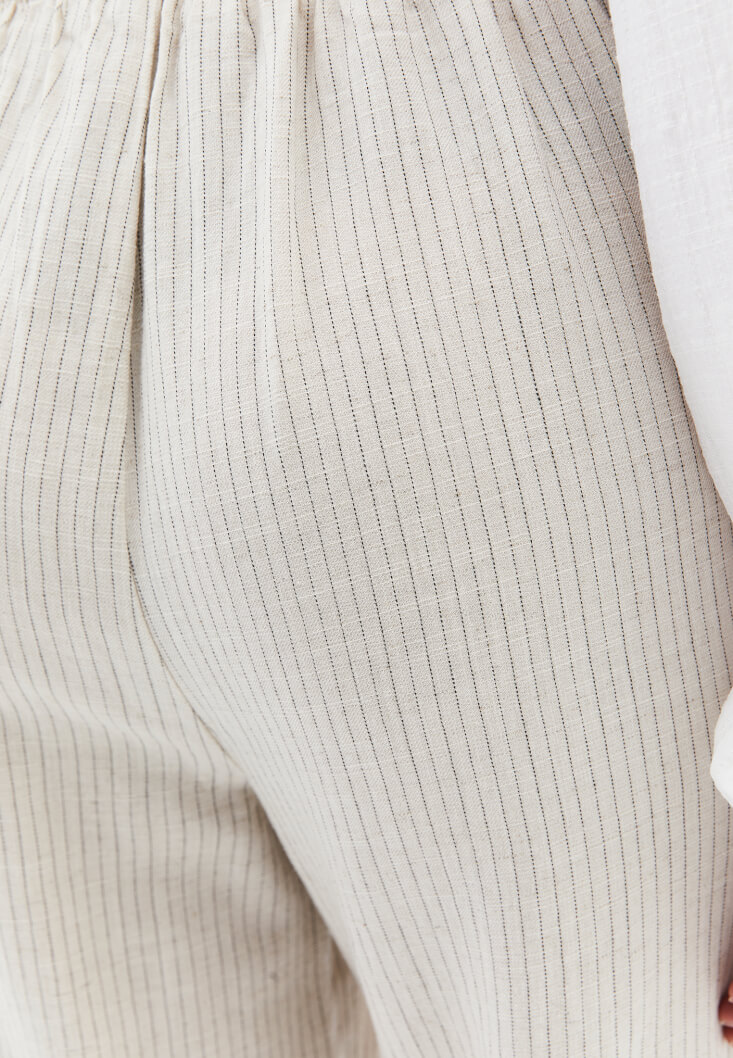 Keten, pamuk ve viskon karışımlı doğal içerik, ultra yüksek bel, arka bel kısmı lastikli, iki cepli, bol paça, ön bel kısmı pileli, çizgi desenli.