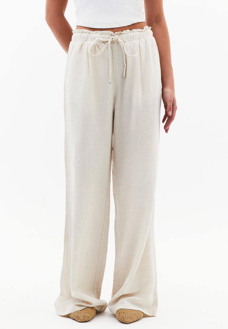 Keten karışımlı dokusuyla yaz aylarında nefes alan bir konfor sunan bu pantolon, yüksek bel ve wide leg formuyla hem modern hem de özgür bir siluet yaratıyor. Hafif dökümlü yapısı hareket ettikçe zarif bir akış sağlar, doğal tonu ise her kombine kolaylıkla uyum sağlar.