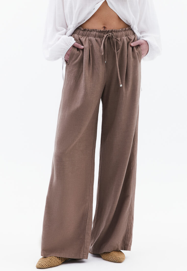 • Bayan Kahverengi Keten Karışımlı Wide-Leg Pantolon
