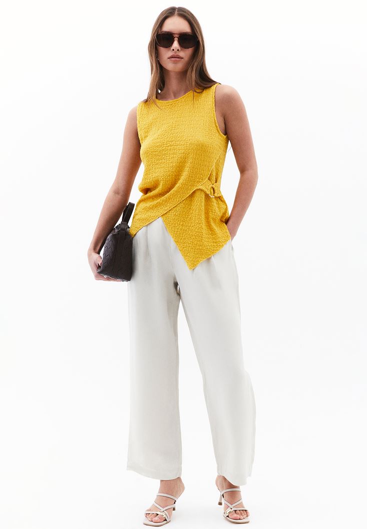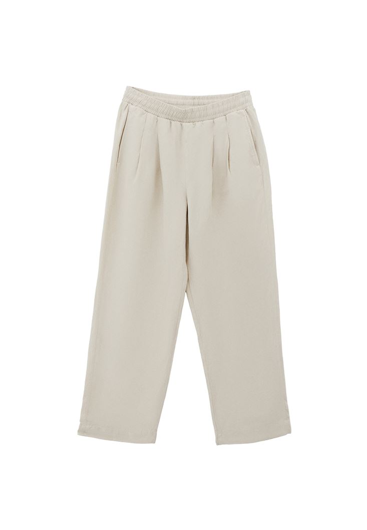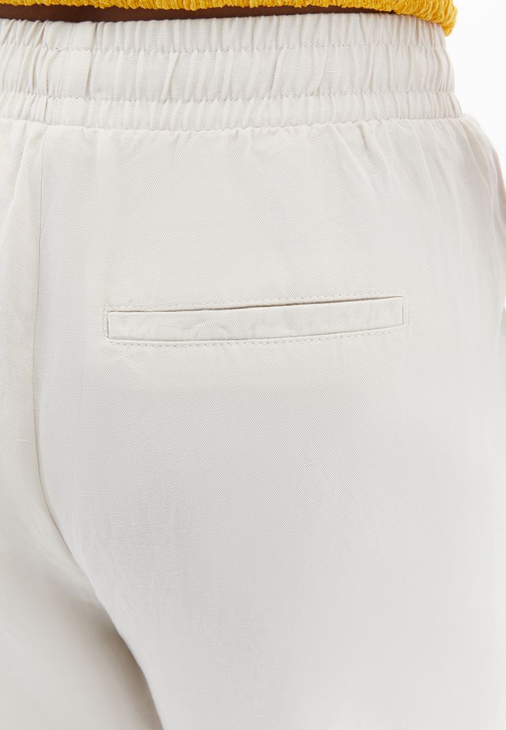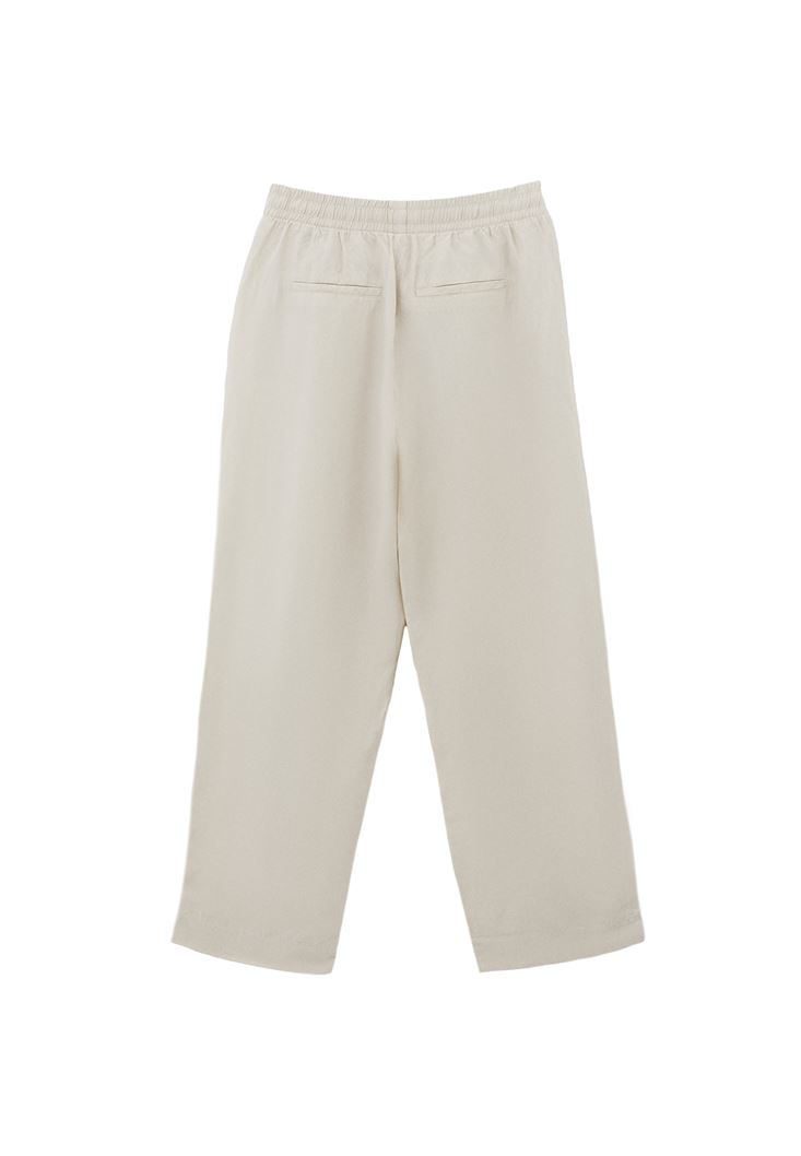 Tencel(Lyocell) ve keten içerikli doğal doku, yüksek bel, bedenden uzak rahat fit, straight paça, beli lastikli, iki cepli.