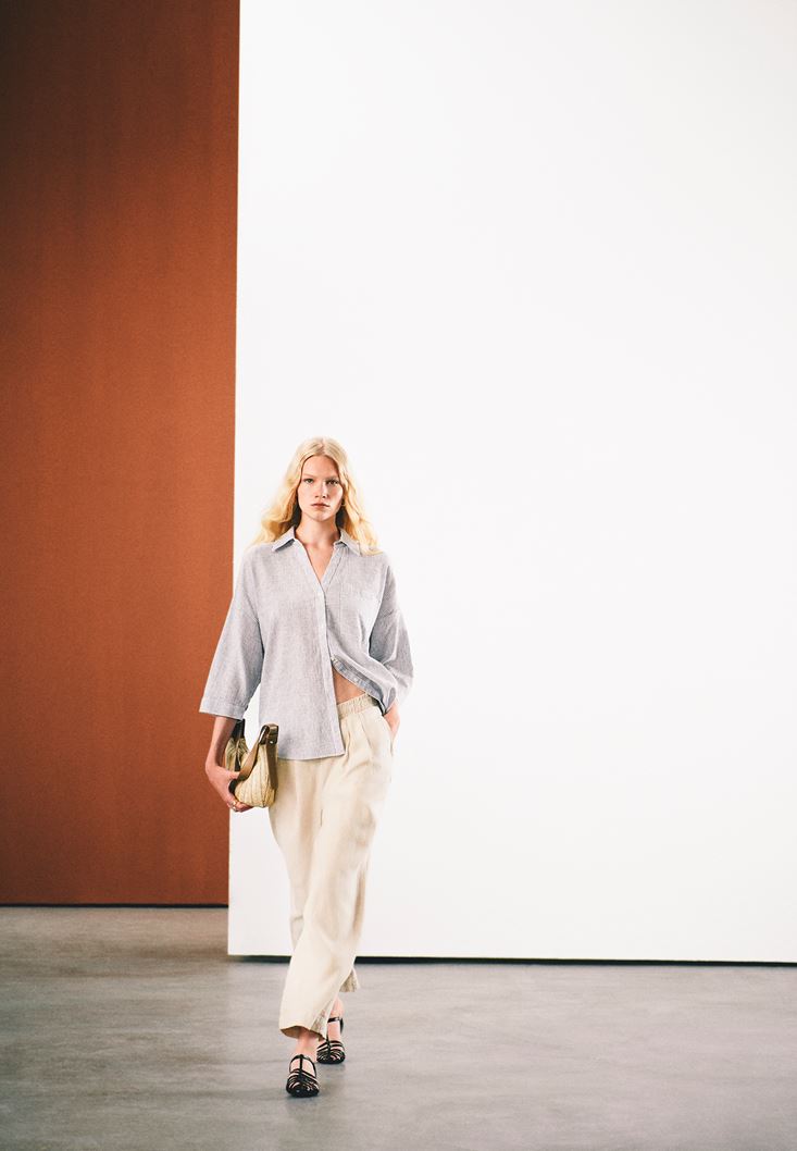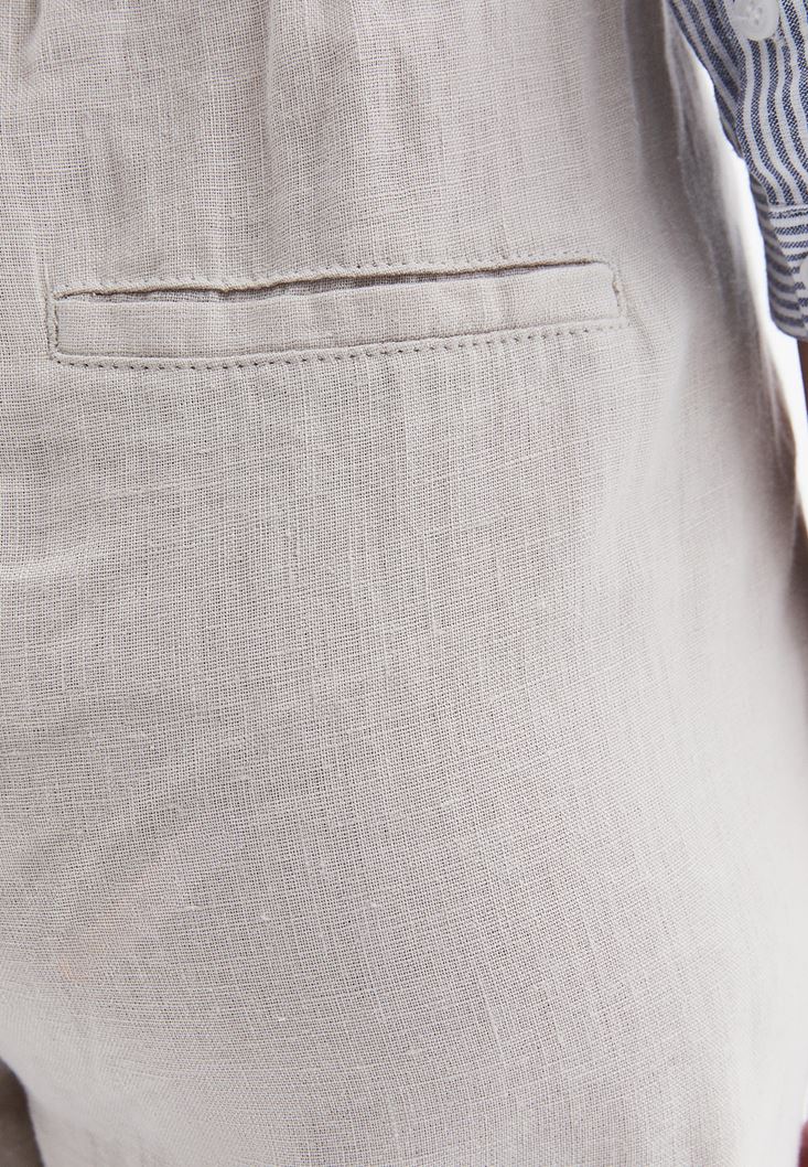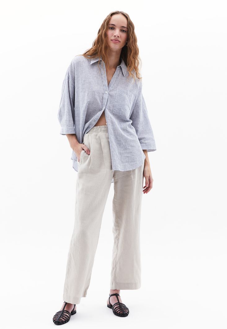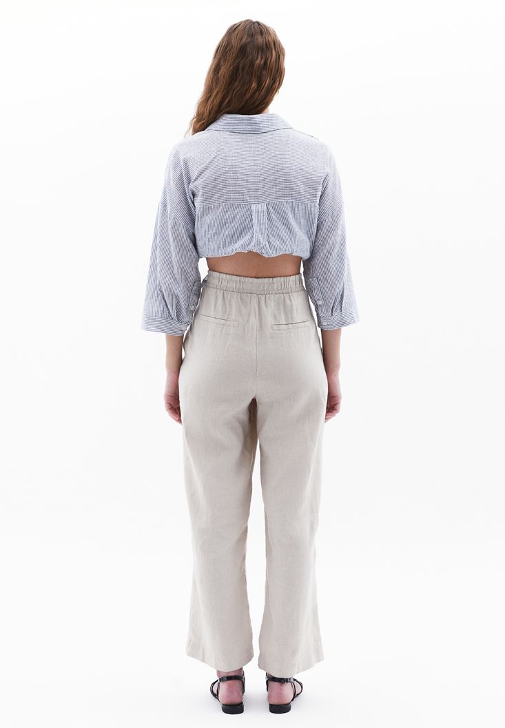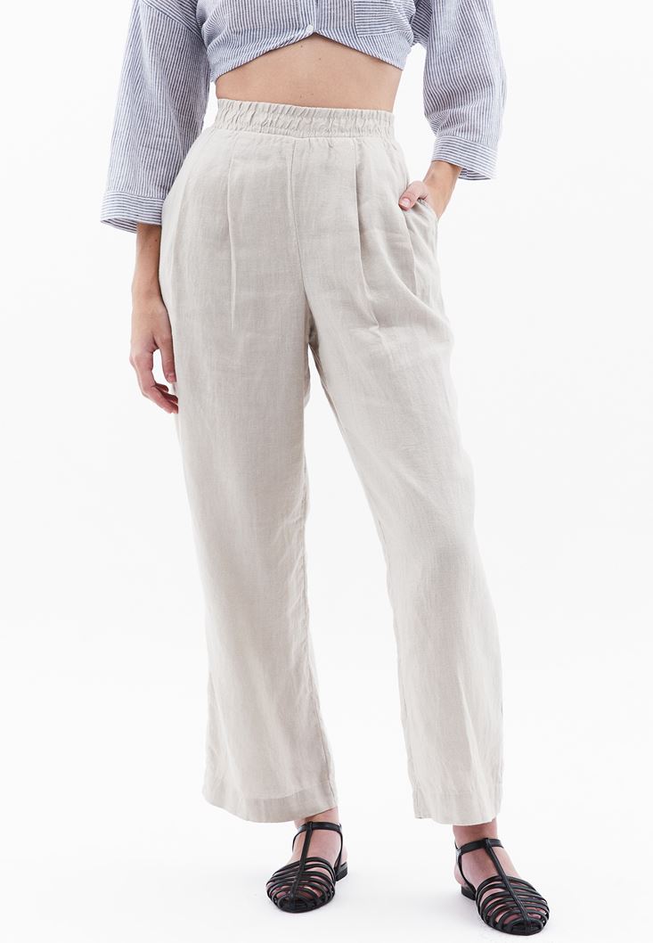 %100 keten içerikli doğal doku, bedenden uzak rahat fit, beli lastikli, iki cepli, ön bel kısmı pile detaylı, straight paça, yüksek bel.