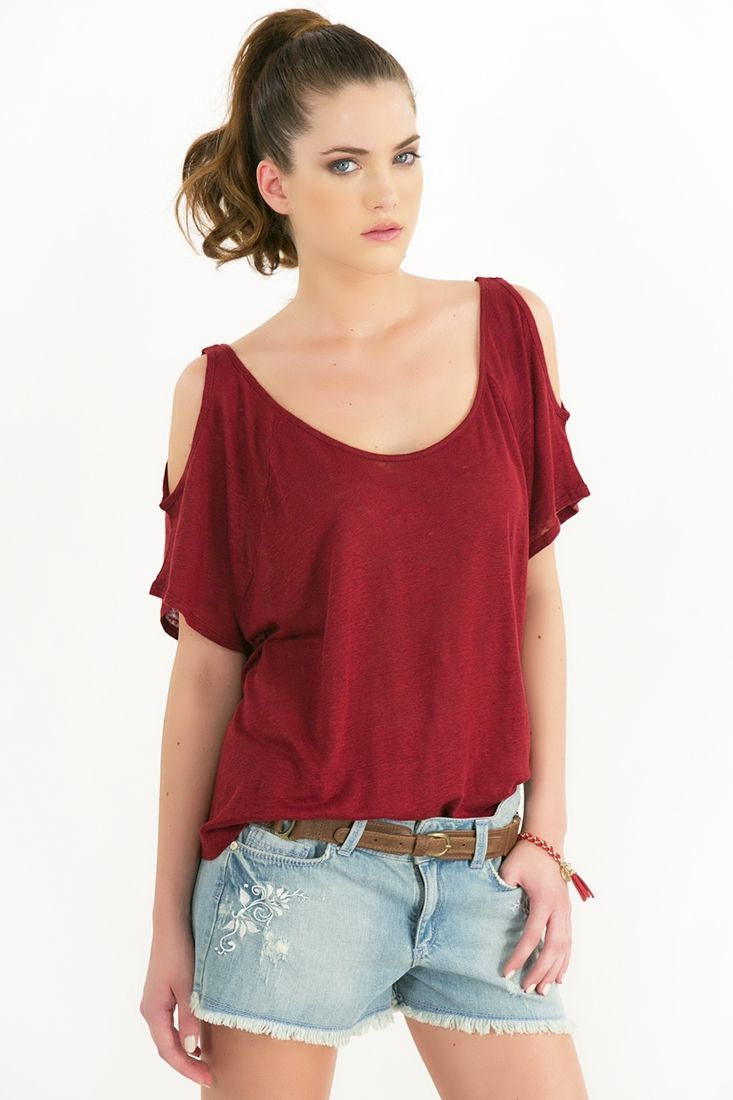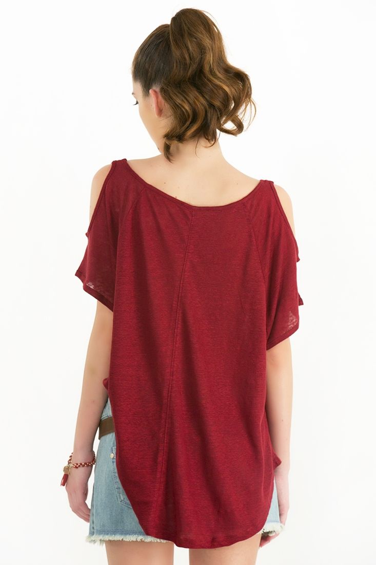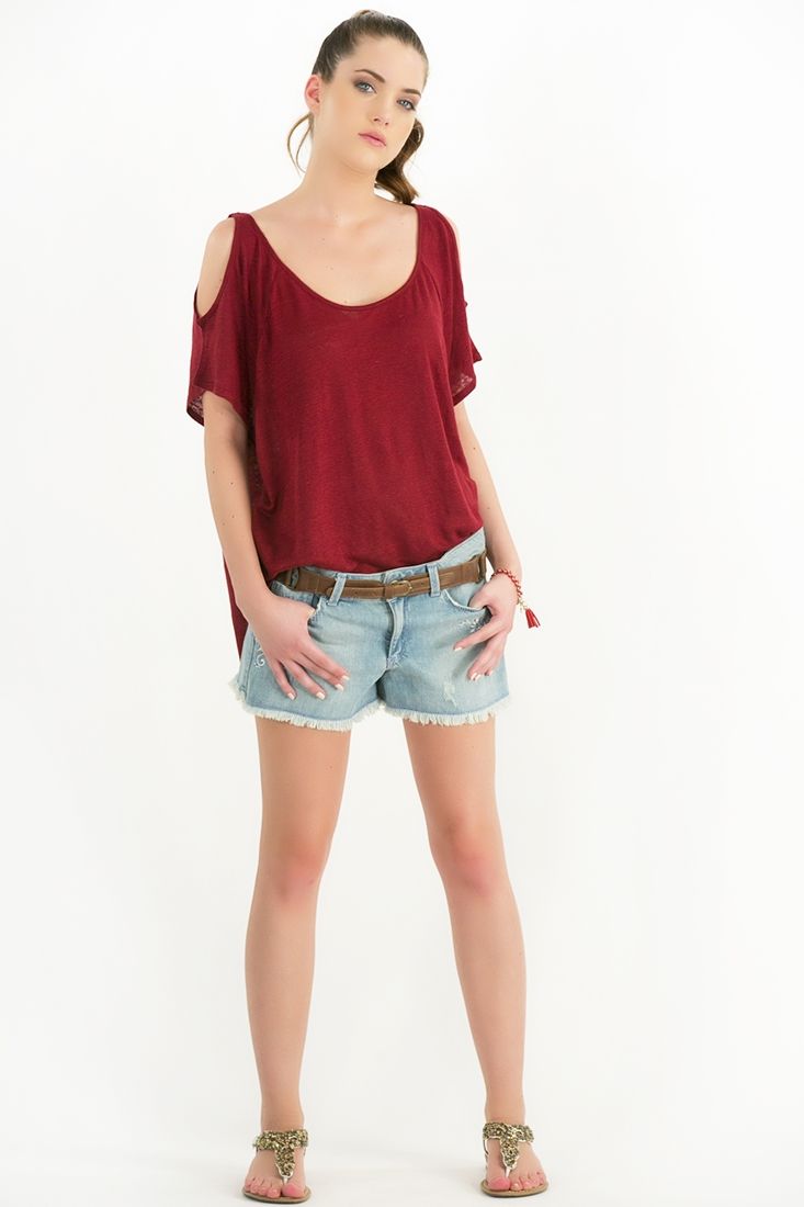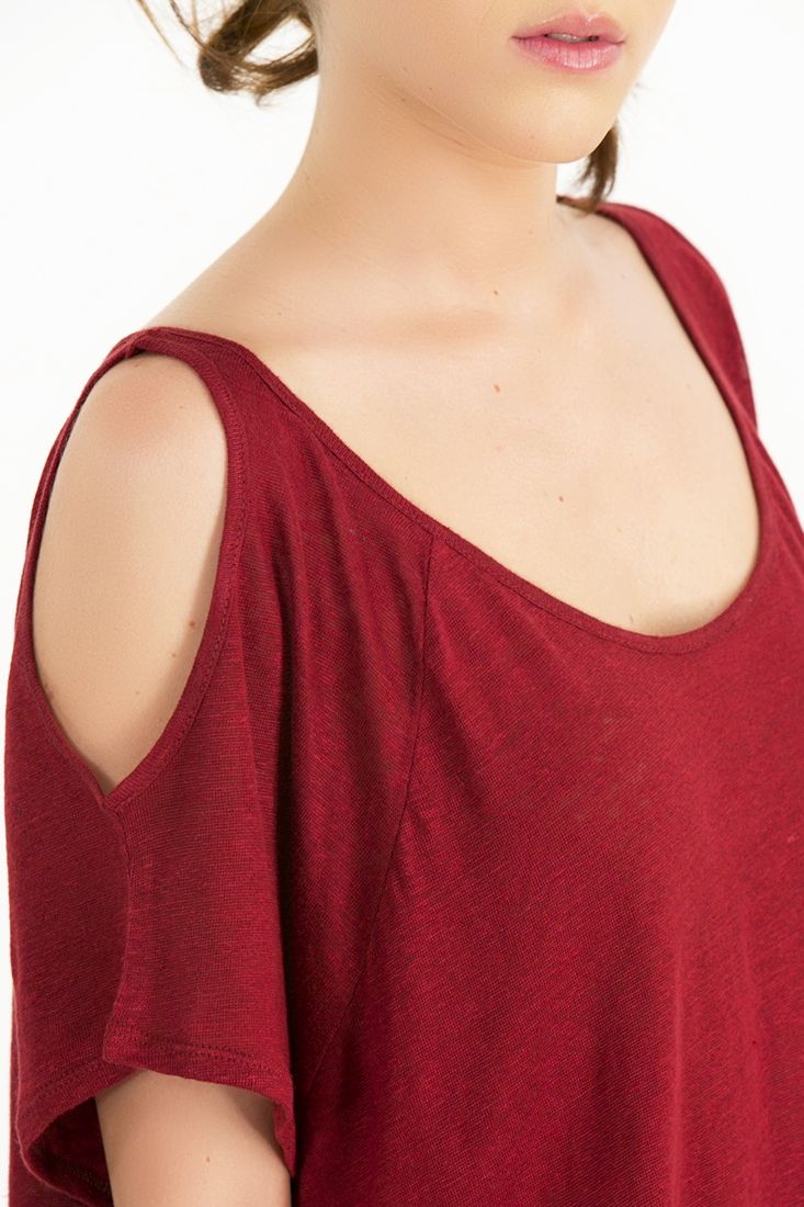 Keten kumaştan, omuz detaylı, kısa kollu bluz.