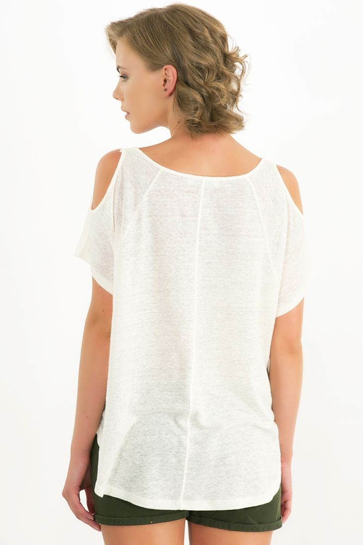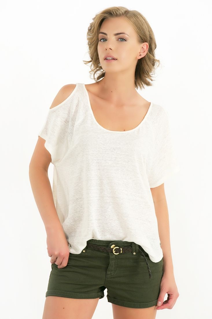 Keten kumaştan, omuz detaylı, kısa kollu bluz.