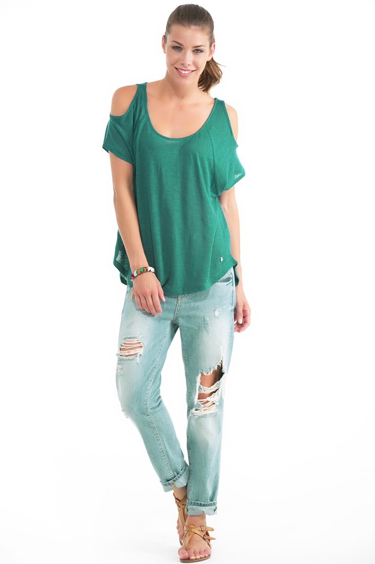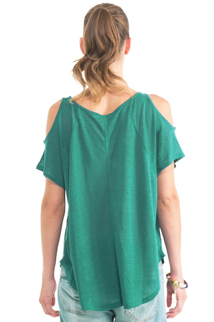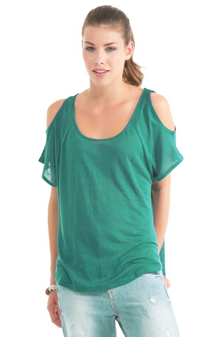 Keten kumaştan, omuz detaylı, kısa kollu bluz.