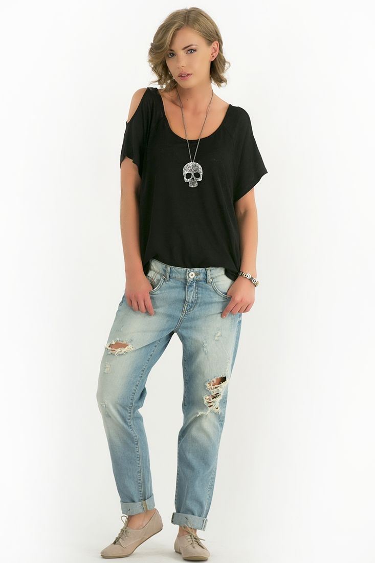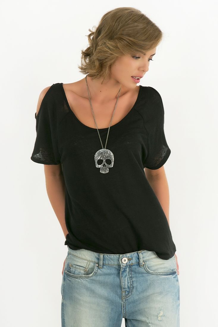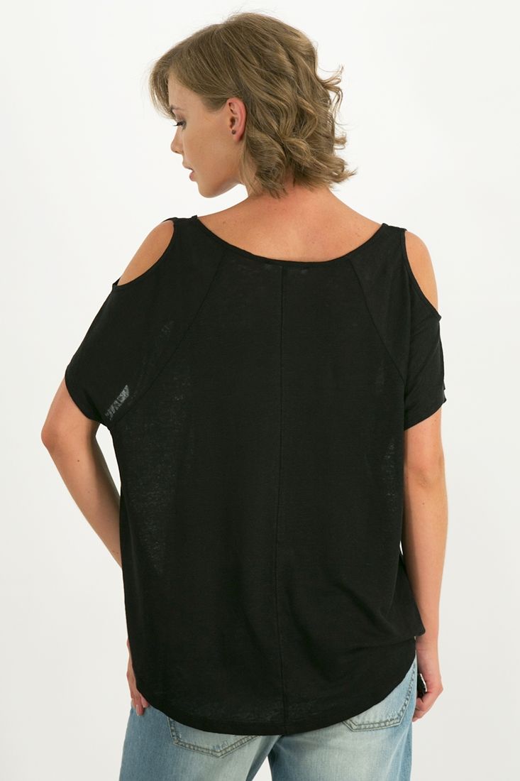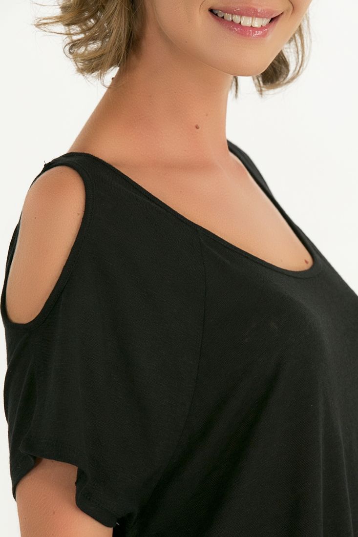 Keten kumaştan, omuz detaylı, kısa kollu bluz.