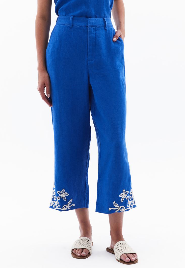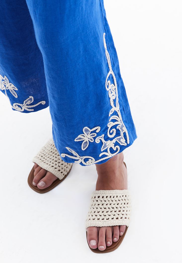 %100 keten içerikli doğal doku, ultra yüksek bel, straight fit, düz paça, bedene yakın rahat fit, paça ucu nakış detaylı, iki cepli, arka bel kısmı lastikli.