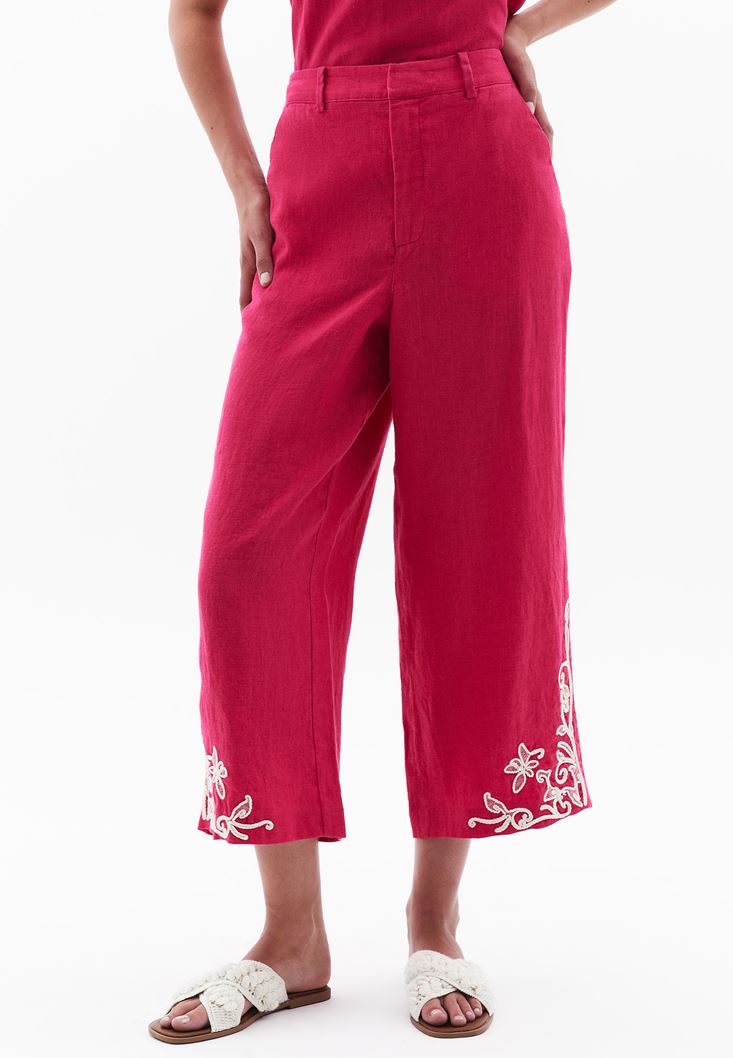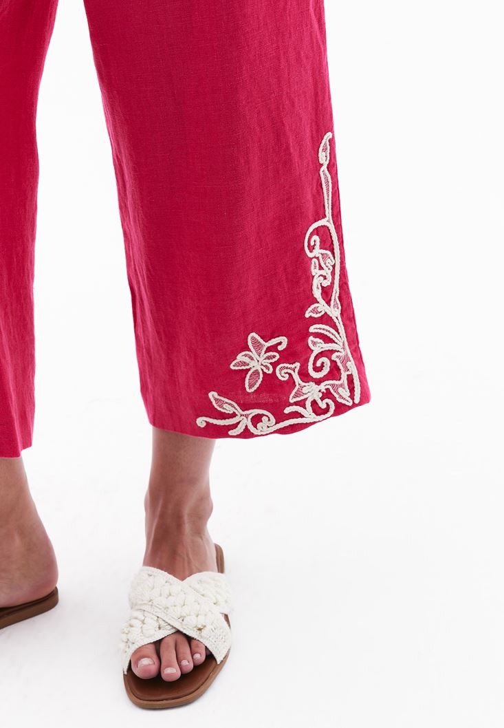 %100 keten içerikli doğal doku, ultra yüksek bel, straight fit, düz paça, bedene yakın rahat fit, paça ucu nakış detaylı, iki cepli, arka bel kısmı lastikli.